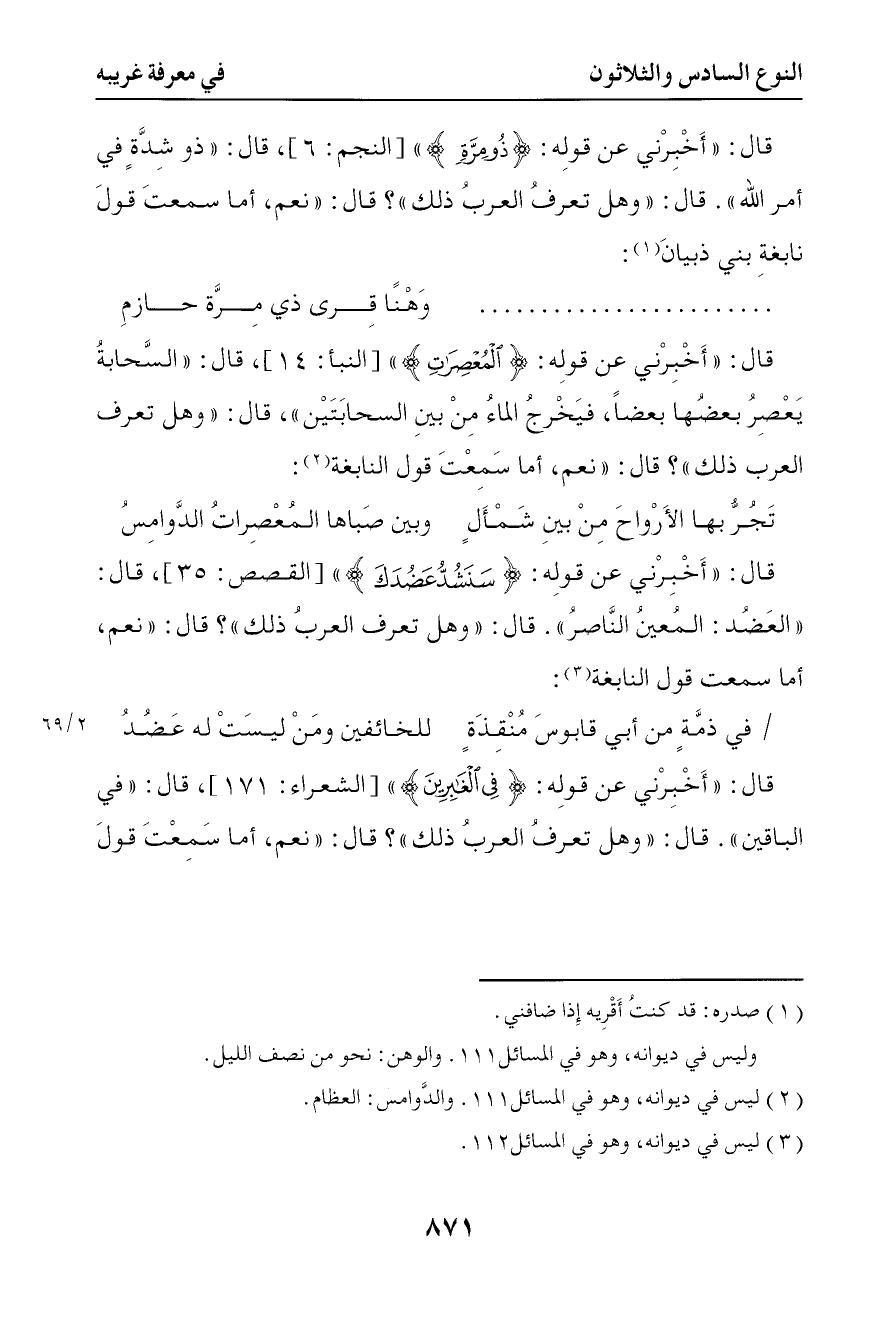 2315 قال أخبرني عن قوله تعالى { سنشد عضدك } قال العضد المعين الناصر قال وهل تعرف العرب ذلك قال نعم أما سمعت قول النابغة