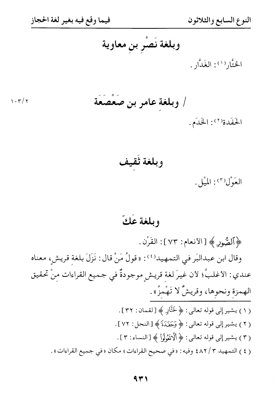 2636 وقال ابن عبد البر في التمهيد قول من قال نزل بلغة قريش معناه عندي الأغلب لأن غير لغة قريش موجودة في جميع القراءات من تحقيق الهمزة ونحوها وقريش لا تهمز