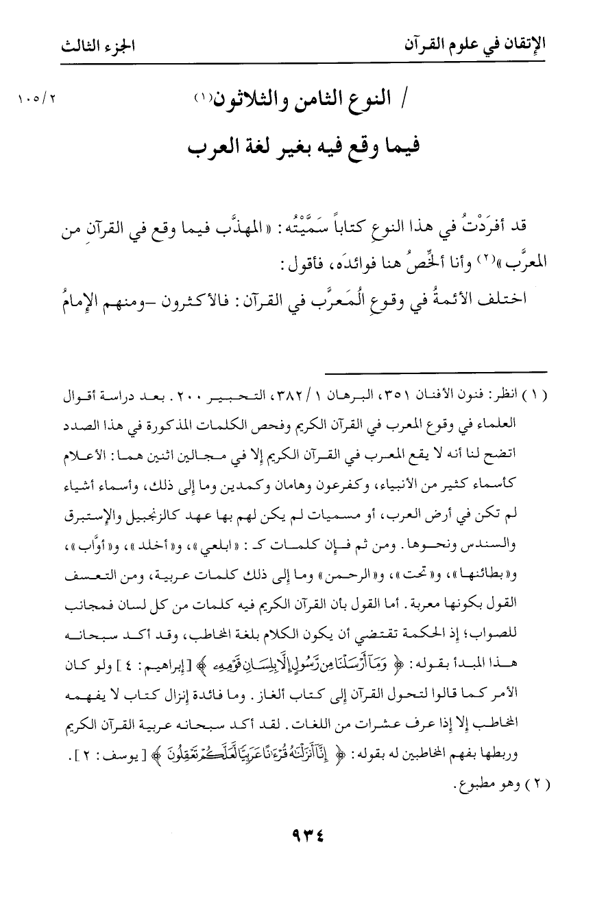 2641 قد أفردت في هذا النوع كتابا سميته المهذب فيما وقع في القرآن من المعرب وها أنا ألخص هنا فوائده فأقول اختلف الأئمة في وقوع المعرب في القرآن فالأكثرون ومنهم الإمام