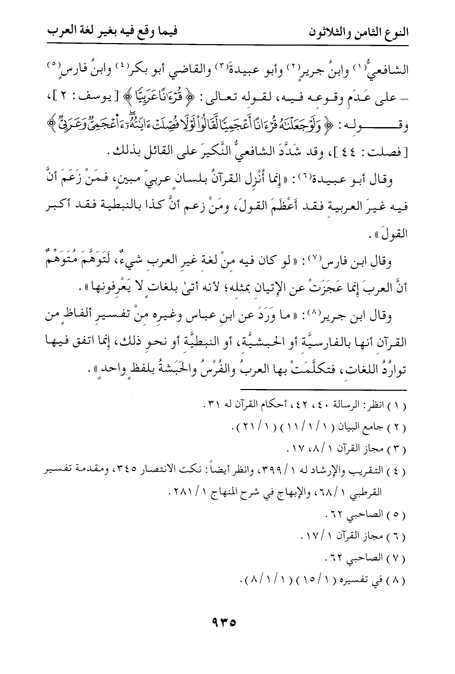 2644 وقال ابن جرير ما ورد عن ابن عباس وغيره من تفسير ألفاظ من القرآن إنها بالفارسية أو الحبشية أو النبطية أو نحو ذلك إنما اتفق فيها توارد اللغات فتكلمت بها العرب والفرس والحبشة بلفظ واحد