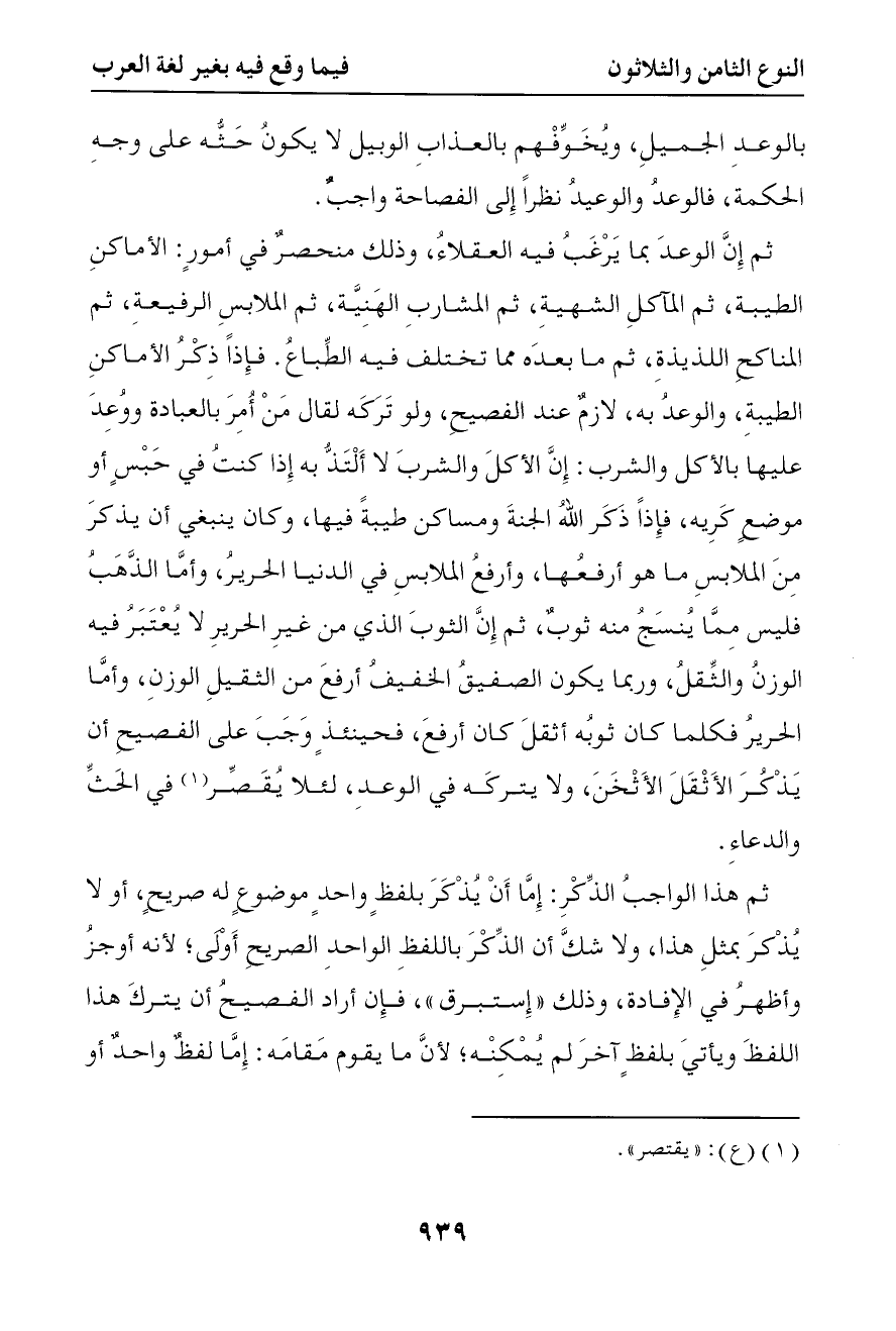 بالوعد الجميل ويخوفهم بالعذاب الوبيل لا يكون حثه على وجه الحكمة فالوعد والوعيد نظرا إلى الفصاحة واجب ثم إن الوعد بما يرغب فيه العقلاء وذلك منحصر في أمور الأماكن الطيبة ثم المآكل الشهية ثم المشارب الهنية ثم الملابس الرفيعة ثم المناكح اللذيذة ثم ما بعده مما يختلف فيه الطباع فإذن ذكر الأماكن الطيبة والوعد به لازم عند الفصيح ولو تركه لقال من أمر بالعبادة ووعد عليها بالأكل والشرب إن الأكل والشرب لا ألتذ به إذا كنت في حبس أو موضع كريه فإذن ذكر الله الجنة ومساكن طيبة فيها وكان ينبغي أن يذكر من الملابس ما هو أرفعها وأرفع الملابس في الدنيا الحرير وأما الذهب فليس مما ينسج منه ثوب ثم إن الثوب الذي من غير الحرير لا يعتبر فيه الوزن والثقل وربما يكون الصفيق الخفيف أرفع من الثقيف الوزن وأما الحرير فكلما كان ثوبه أثقل كان أرفع فحينئذ وجب على الفصيح أن يذكر الأثقل والأثخن ولا يتركه في الوعد لئلا يقصر في الحث والدعاء ثم هذا الواجب الذكر إما أن يذكر بلفظ واحد موضوع له صريح أو لا يذكر بمثل هذا ولا شك أن الذكر باللفظ الواحد الصريح أولى لأنه أوجز وأظهر في الإفادة وذلك إستبرق فإن أراد الفصيح أن يترك هذا اللفظ ويأتي بلفظ آخر لم يمكنه لأن ما يقوم مقامه إما لفظ واحد أو