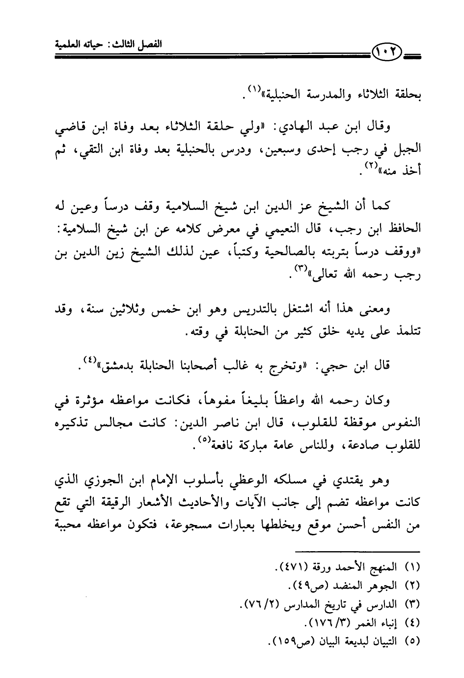 وقال ابن عبد الهادي: "ولي حلقة الثلاثاء بعد وفاة ابن قاضي الجبل في رجب إحدى وسبعين، ودرس بالحنبلية بعد وفاة ابن التقي، ثم أخذ منه" (¬٢).