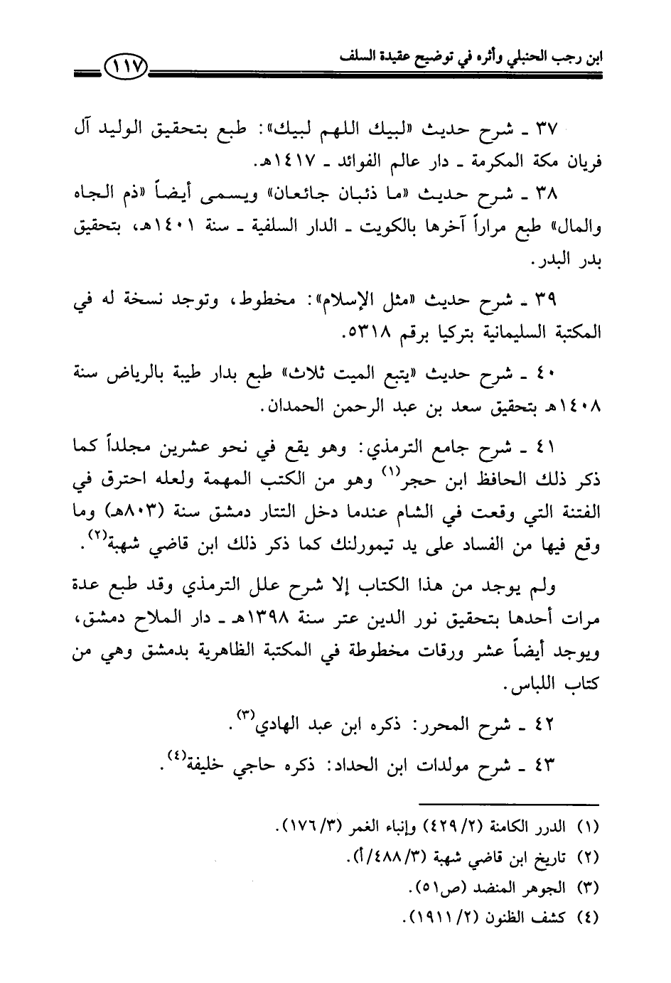 ٤١ - شرح جامع الترمذي: وهو يقع في نحو عشرين مجلدًا كما ذكر ذلك الحافظ ابن حجر (¬١) وهو من الكتب المهمة ولعله احترق في الفتنة التي وقعت في الشام عندما دخل التتار دمشق سنة (٨٠٣ هـ) وما وقع فيها من الفساد على يد تيمورلنك كما ذكر ذلك ابن قاضي شهبة (¬٢).