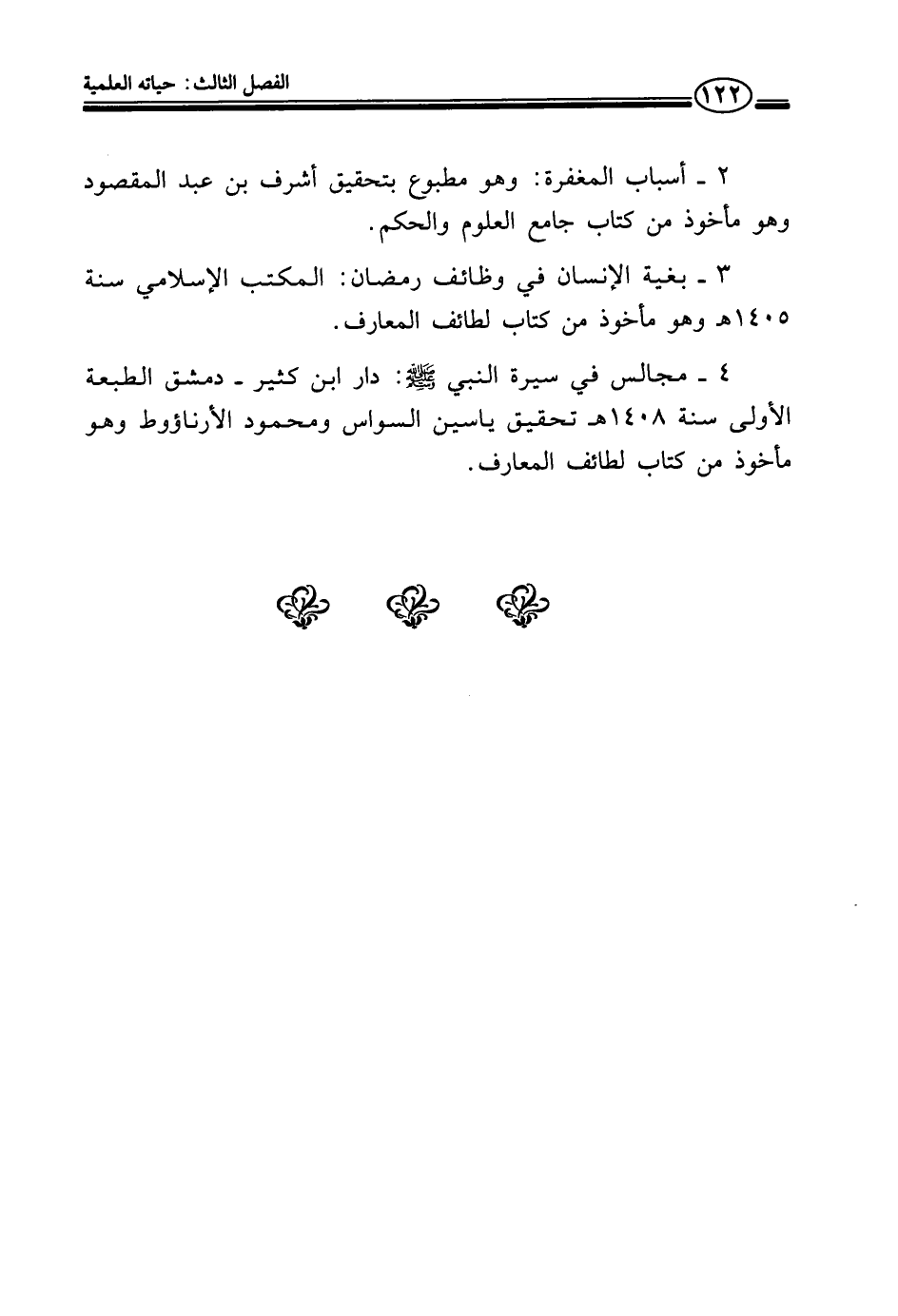 ٤ - مجالس في سيرة النبي - صلى الله عليه وسلم -: دار ابن كثير - دمشق الطبعة الأولى سنة ١٤٠٨ هـ تحقيق ياسين السواس ومحمود الأرناؤوط وهو مأخوذ من كتاب لطائف المعارف.