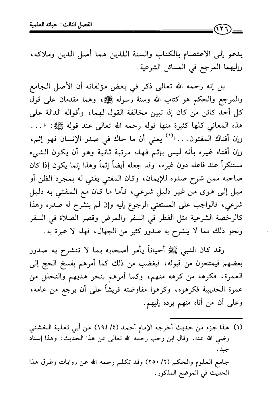 بل إنه رحمه الله تعالى ذكر في بعض مؤلفاته أن الأصل الجامع والمرجع والحكم هو كتاب الله وسنة رسوله - صلى الله عليه وسلم -، وهما مقدمان على قول كل أحد كائن من كان إذا تبين مخالفة القول لهما، وأقواله الدالة على هذه المعاني كلها كثيرة منها قوله رحمه الله تعالى عند قوله - صلى الله عليه وسلم -: ". . . وإن أفتاك المفتون. . . " (¬١) يعني أن ما حاك في صدر الإنسان فهو إثم، وإن أفتاه غيره بأنه ليس بإثم فهذه مرتبة ثانية وهو أن يكون الشيء مستنكرًا عند فاعله دون غيره، وقد جعله أيضًا إثمًا وهذا إنما يكون إذا كان صاحبه ممن شرح صدره للإيمان، وكان المفتي يفتي له بمجرد الظن أو ميل إلى هوى من غير دليل شرعي، فأما ما كان مع المفتي به دليل شرعي، فالواجب على المستفتي الرجوع إليه وإن لم ينشرح له صدره وهذا كالرخصة الشرعية مثل الفطر في السفر والمرض وقصر الصلاة في السفر ونحو ذلك مما لا ينشرح به صدور كثير من الجهال، فهذا لا عبرة به.