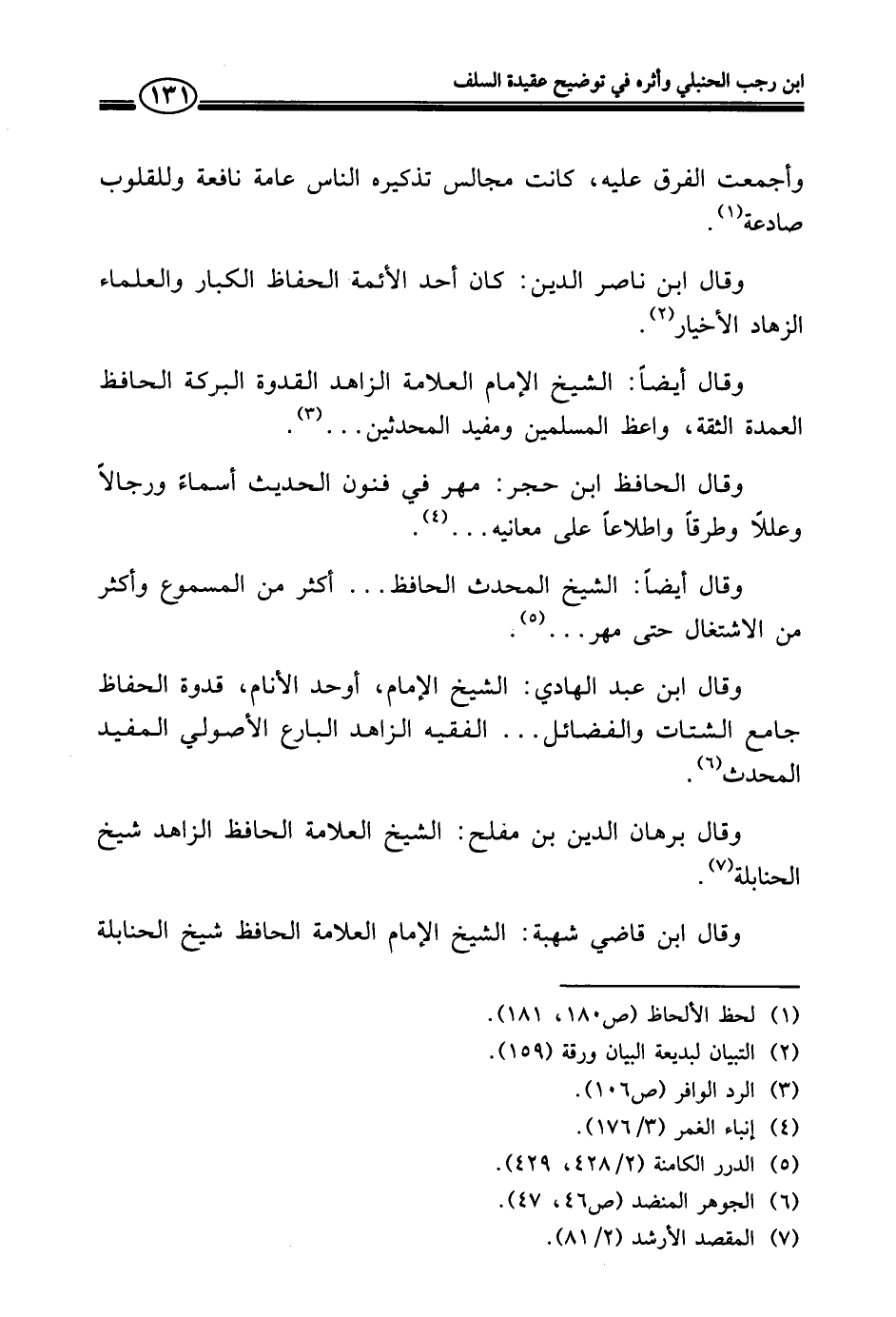وقال ابن قاضي شهبة: الشيخ الإمام العلامة الحافظ شيخ الحنابلة