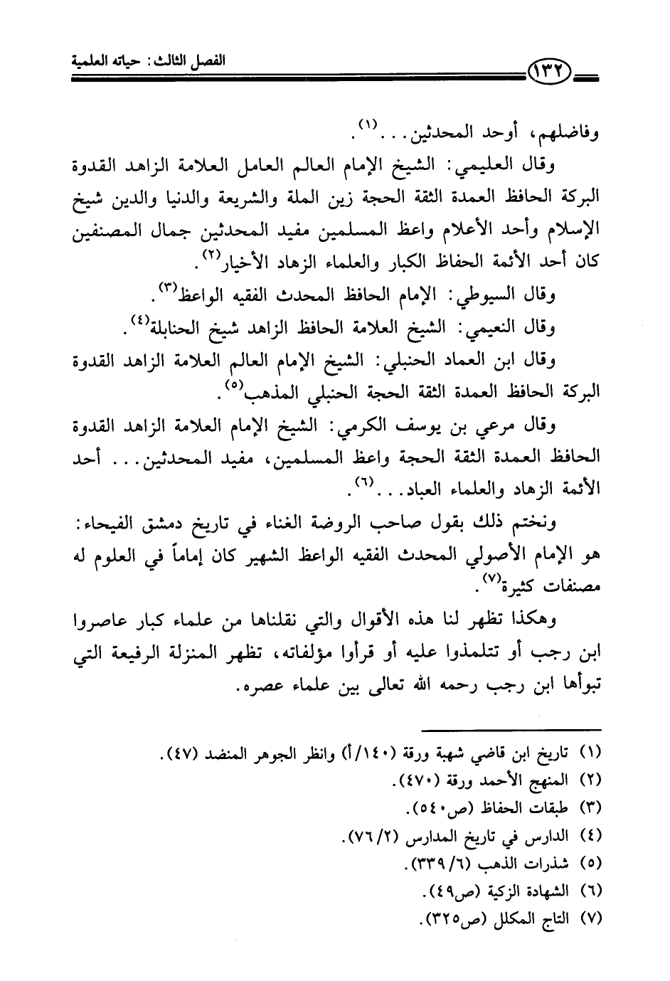 وهكذا تظهر لنا هذه الأقوال والتي نقلناها من علماء كبار عاصروا ابن رجب أو تتلمذوا عليه أو قرأوا مؤلفاته، تظهر المنزلة الرفيعة التي تبوأها ابن رجب رحمه الله تعالى بين علماء عصره.