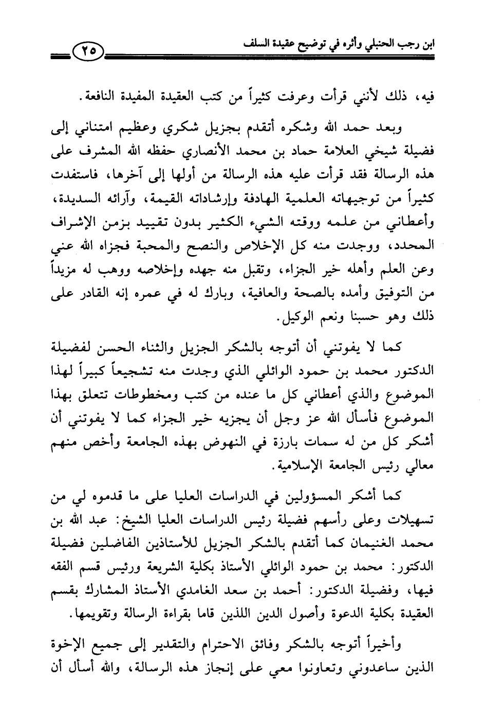 كما لا يفوتني أن أتوجه بالشكر الجزيل والثناء الحسن لفضيلة الدكتور محمد بن حمود الوائلي الذي وجدت منه تشجيعًا كبيرًا لهذا الموضوع والذي أعطاني كل ما عنده من كتب ومخطوطات تتعلق بهذا الموضوع فأسأل الله عز وجل أن يجزيه خير الجزاء كما لا يفوتني أن أشكر كل من له سمات بارزة في النهوض بهذه الجامعة وأخص منهم معالي رئيس الجامعة الإسلامية.
