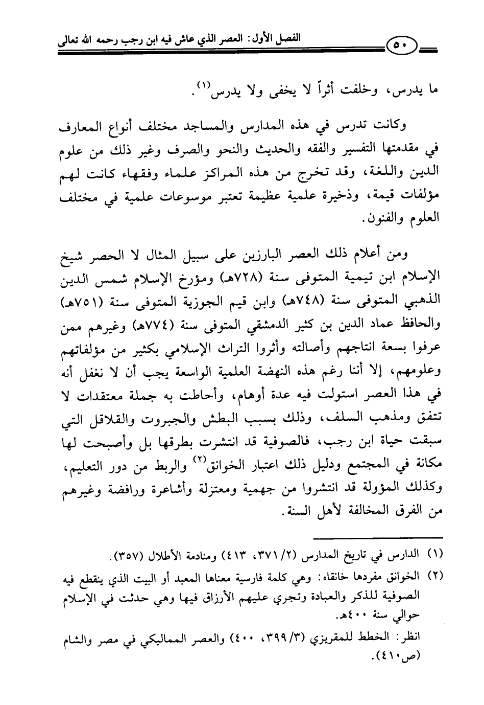 ومن أعلام ذلك العصر البارزين على سبيل المثال لا الحصر شيخ الإسلام ابن تيمية المتوفى سنة (٧٢٨ هـ) ومؤرخ الإسلام شمس الدين الذهبي المتوفى سنة (٧٤٨ هـ) وابن قيم الجوزية المتوفى سنة (٧٥١ هـ) والحافظ عماد الدين بن كثير الدمشقي المتوفى سنة (٧٧٤ هـ) وغيرهم ممن عرفوا بسعة انتاجهم وأصالته وأثروا التراث الإسلامي بكثير من مؤلفاتهم وعلومهم، إلا أننا رغم هذه النهضة العلمية الواسعة يجب أن لا نغفل أنه في هذا العصر استولت فيه عدة أوهام، وأحاطت به جملة معتقدات لا تتفق ومذهب السلف، وذلك بسبب البطش والجبروت والقلاقل التي سبقت حياة ابن رجب، فالصوفية قد انتشرت بطرقها بل وأصبحت لها مكانة في المجتمع ودليل ذلك اعتبار الخوانق (¬٢) والربط من دور التعليم، وكذلك المؤولة قد انتشروا من جهمية ومعتزلة وأشاعرة ورافضة وغيرهم من الفرق المخالفة لأهل السنة.