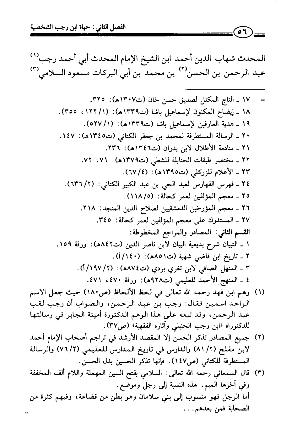 (¬١) وهم ابن فهد رحمه الله تعالى في لحظ الألحاظ (ص ١٨٠) حيث جعل الاسم الواحد اسمين فقال: رجب بن عبد الرحمن، والصواب أن رجب لقب عبد الرحمن، وقد تبعه على هذا الوهم الدكتورة أمينة الجابر في رسالتها للدكتوراه "ابن رجب الحنبلي وآثاره الفقهية" (ص ٣٧).