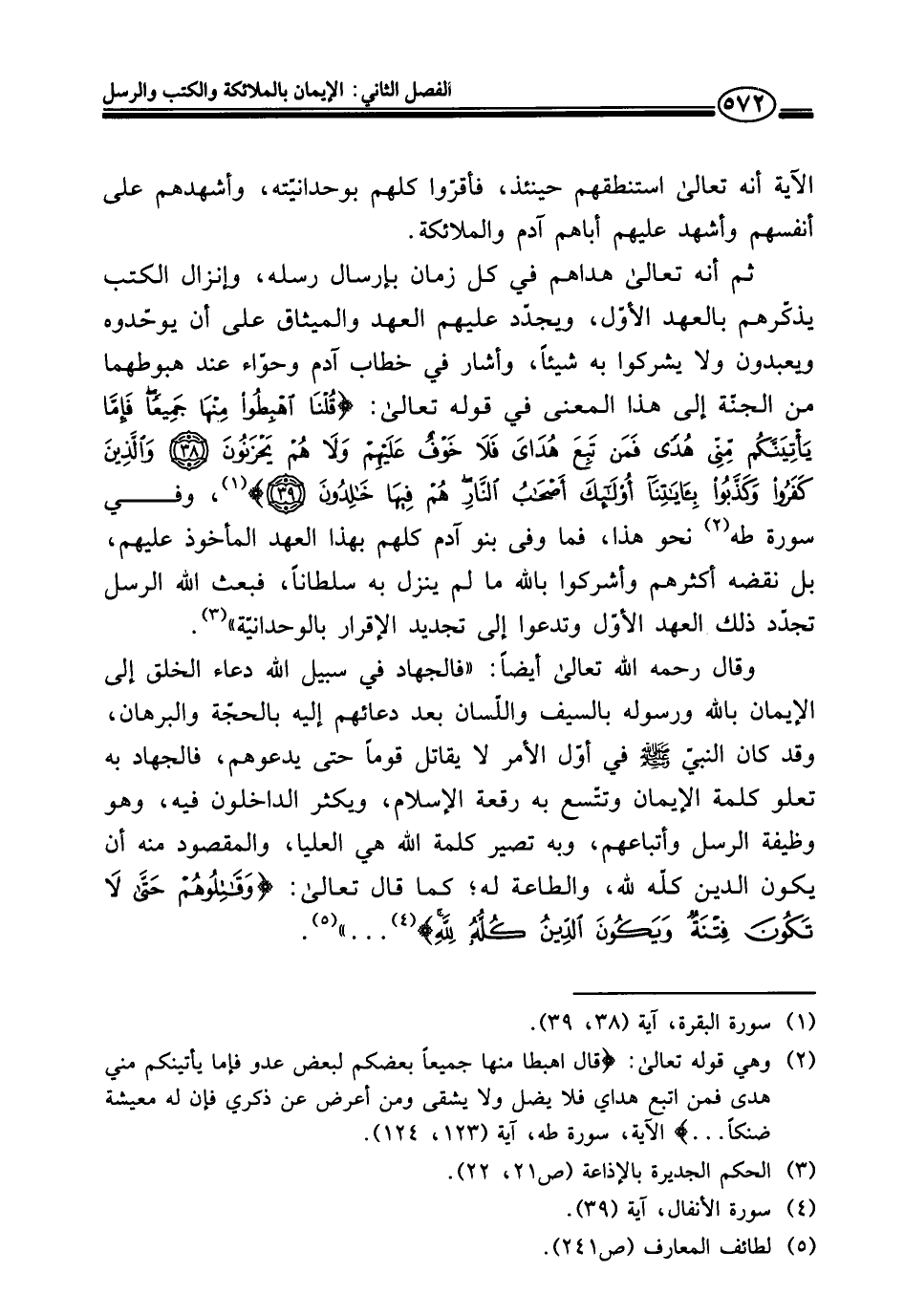 ثم أنه تعالى هداهم في كل زمان بإرسال رسله، وإنزال الكتب يذكّرهم بالعهد الأوّل، ويجدّد عليهم العهد والميثاق على أن يوحّدوه ويعبدون ولا يشركوا به شيئًا، وأشار في خطاب آدم وحوّاء عند هبوطهما من الجنّة إلى هذا المعنى في قوله تعالى: {قُلْنَا اهْبِطُوا مِنْهَا جَمِيعًا فَإِمَّا يَأْتِيَنَّكُمْ مِنِّي هُدًى فَمَنْ تَبِعَ هُدَايَ فَلَا خَوْفٌ عَلَيْهِمْ وَلَا هُمْ يَحْزَنُونَ (٣٨) وَالَّذِينَ كَفَرُوا وَكَذَّبُوا بِآيَاتِنَا أُولَئِكَ أَصْحَابُ النَّارِ هُمْ فِيهَا خَالِدُونَ (٣٩)} (¬١)، وفي سورة طه (¬٢) نحو هذا، فما وفى بنو آدم كلهم بهذا العهد المأخوذ عليهم، بل نقضه أكثرهم وأشركوا بالله ما لم ينزل به سلطانًا، فبعث الله الرسل تجدّد ذلك العهد الأوّل وتدعوا إلى تجديد الإقرار بالوحدانيّة" (¬٣).