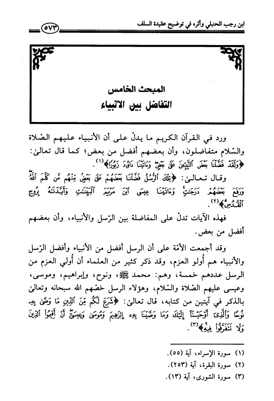 وقال تعالى: {تِلْكَ الرُّسُلُ فَضَّلْنَا بَعْضَهُمْ عَلَى بَعْضٍ مِنْهُمْ مَنْ كَلَّمَ اللَّهُ وَرَفَعَ بَعْضَهُمْ دَرَجَاتٍ وَآتَيْنَا عِيسَى ابْنَ مَرْيَمَ الْبَيِّنَاتِ وَأَيَّدْنَاهُ بِرُوحِ الْقُدُسِ} (¬٢).