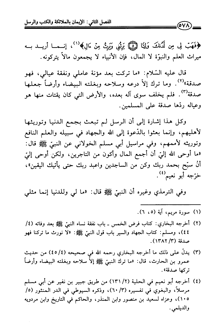 {فَهَبْ لِي مِنْ لَدُنْكَ وَلِيًّا (٥) يَرِثُنِي وَيَرِثُ مِنْ آلِ} (¬١)، إنما أريد به ميراث العلم والنبوّة لا المال، فإن الأنبياء لا يجمعون مالًا يتركونه.