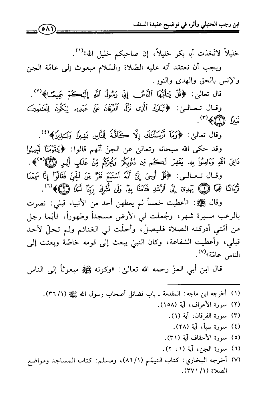 قال ابن أبي العزّ رحمه الله تعالى: "وكونه - صلى الله عليه وسلم - مبعوثًا إلى الناس