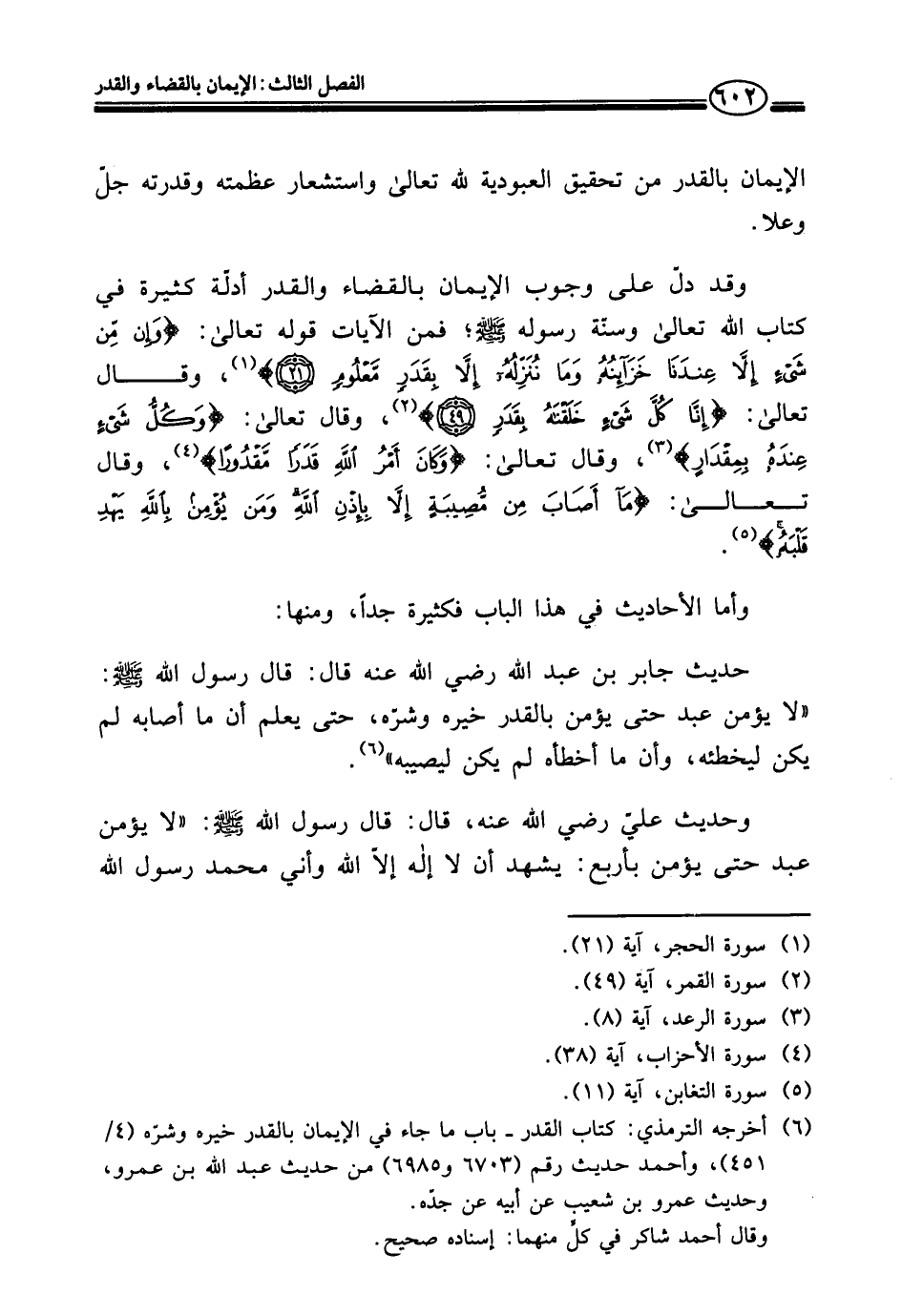 حديث جابر بن عبد الله رضي الله عنه قال: قال رسول الله - صلى الله عليه وسلم -: "لا يؤمن عبد حتى يؤمن بالقدر خيره وشرّه، حتى يعلم أن ما أصابه لم يكن ليخطئه، وأن ما أخطأه لم يكن ليصيبه" (¬٦).