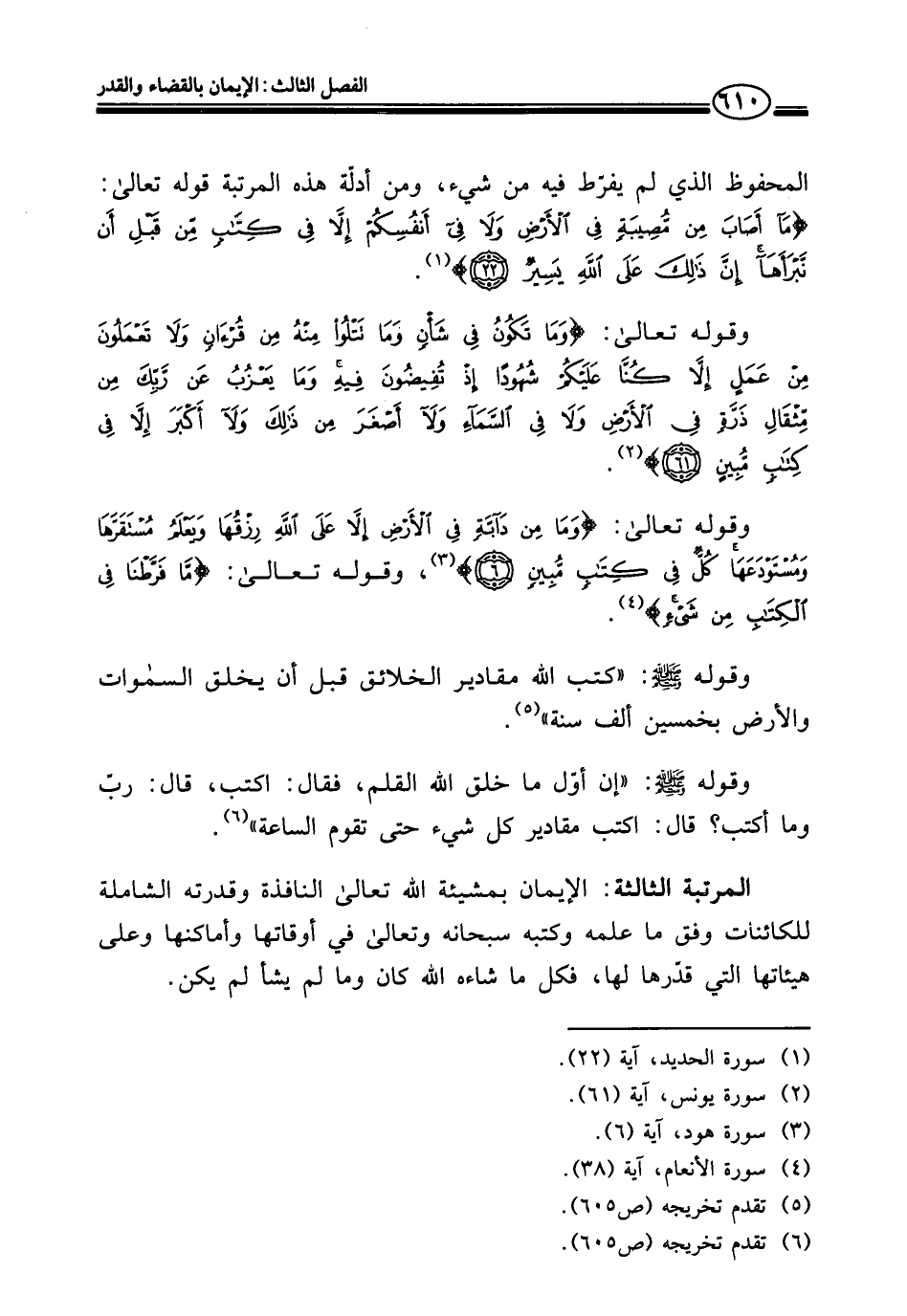 المحفوظ الذي لم يفرّط فيه من شيء، ومن أدلّة هذه المرتبة قوله تعالى: {مَا أَصَابَ مِنْ مُصِيبَةٍ فِي الْأَرْضِ وَلَا فِي أَنْفُسِكُمْ إِلَّا فِي كِتَابٍ مِنْ قَبْلِ أَنْ نَبْرَأَهَا إِنَّ ذَلِكَ عَلَى اللَّهِ يَسِيرٌ (٢٢)} (¬١).
