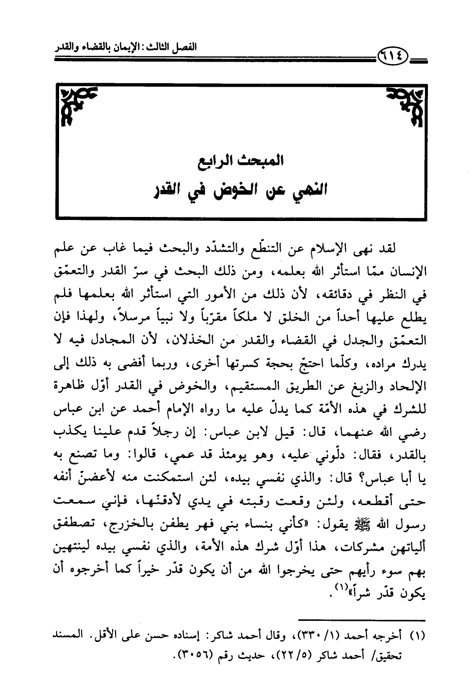 لقد نهى الإسلام عن التنطّع والتشدّد والبحث فيما غاب عن علم الإنسان ممّا استأثر الله بعلمه، ومن ذلك البحث في سرّ القدر والتعمّق في النظر في دقائقه، لأن ذلك من الأمور التي استأثر الله بعلمها فلم يطلع عليها أحدًا من الخلق لا ملكًا مقرّبًا ولا نبيًا مرسلًا، ولهذا فإن التعمّق والجدل في القضاء والقدر من الخذلان، لأن المجادل فيه لا يدرك مراده، وكلّما احتجّ بحجة كسرتها أخرى، وربما أفضى به ذلك إلى الإلحاد والزيغ عن الطريق المستقيم، والخوض في القدر أوّل ظاهرة للشرك في هذه الأمّة كما يدلّ عليه ما رواه الإمام أحمد عن ابن عباس رضي الله عنهما، قال: قيل لابن عباس: إن رجلًا قدم علينا يكذب بالقدر، فقال: دلّوني عليه، وهو يومئذ قد عمي، قالوا: وما تصنع به يا أبا عباس؟ قال: والذي نفسي بيده، لئن استمكنت منه لأعضنّ أنفه حتى أقطعه، ولئن وقعت رقبته في يدي لأدقنّها، فإني سمعت رسول الله - صلى الله عليه وسلم - يقول: "كأني بنساء بني فهر يطفن بالخزرج، تصطفق ألياتهن مشركات، هذا أوّل شرك هذه الأمة، والذي نفسي بيده لينتهين بهم سوء رأيهم حتى يخرجوا الله من أن يكون قدّر خيرًا كما أخرجوه أن يكون قدّر شرًا" (¬١).