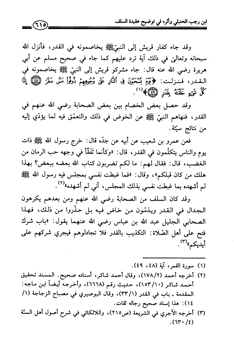 وقد كان السلف من الصحابة رضي الله عنهم ومن بعدهم يكرهون الجدال في القدر ويذمّون من خاض فيه بل حذّروا من ذلك، فهذا الصحابي الجليل عبد الله بن عباس رضي الله عنهما يقول: "باب شرك فتح على أهل الصّلاة: التكذيب بالقدر فلا تجادلوهم فيجري شركهم على أيديكم" (¬٣).