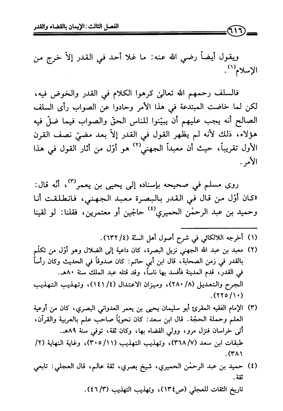 روى مسلم في صحيحه بإسناده إلى يحيى بن يعمر (¬٣)، أنّه قال: "كان أوّل من قال في القدر بالبصرة معبد الجهني، فانطلقت أنا وحميد بن عبد الرحمن الحميري (¬٤) حاجّين أو معتمرين، فقلنا: لو لقينا
