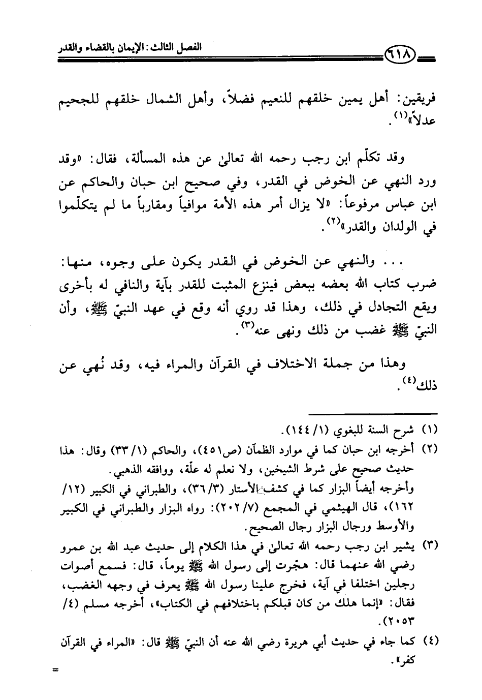 (¬٣) يشير ابن رجب رحمه الله تعالى في هذا الكلام إلى حديث عبد الله بن عمرو رضي الله عنهما قال: هجّرت إلى رسول الله - صلى الله عليه وسلم - يومًا، قال: فسمع أصوات رجلين اختلفا في آية، فخرج علينا رسول الله - صلى الله عليه وسلم - يعرف في وجهه الغضب، فقال: "إنما هلك من كان قبلكم باختلافهم في الكتاب"، أخرجه مسلم (٤/ ٢٠٥٣).