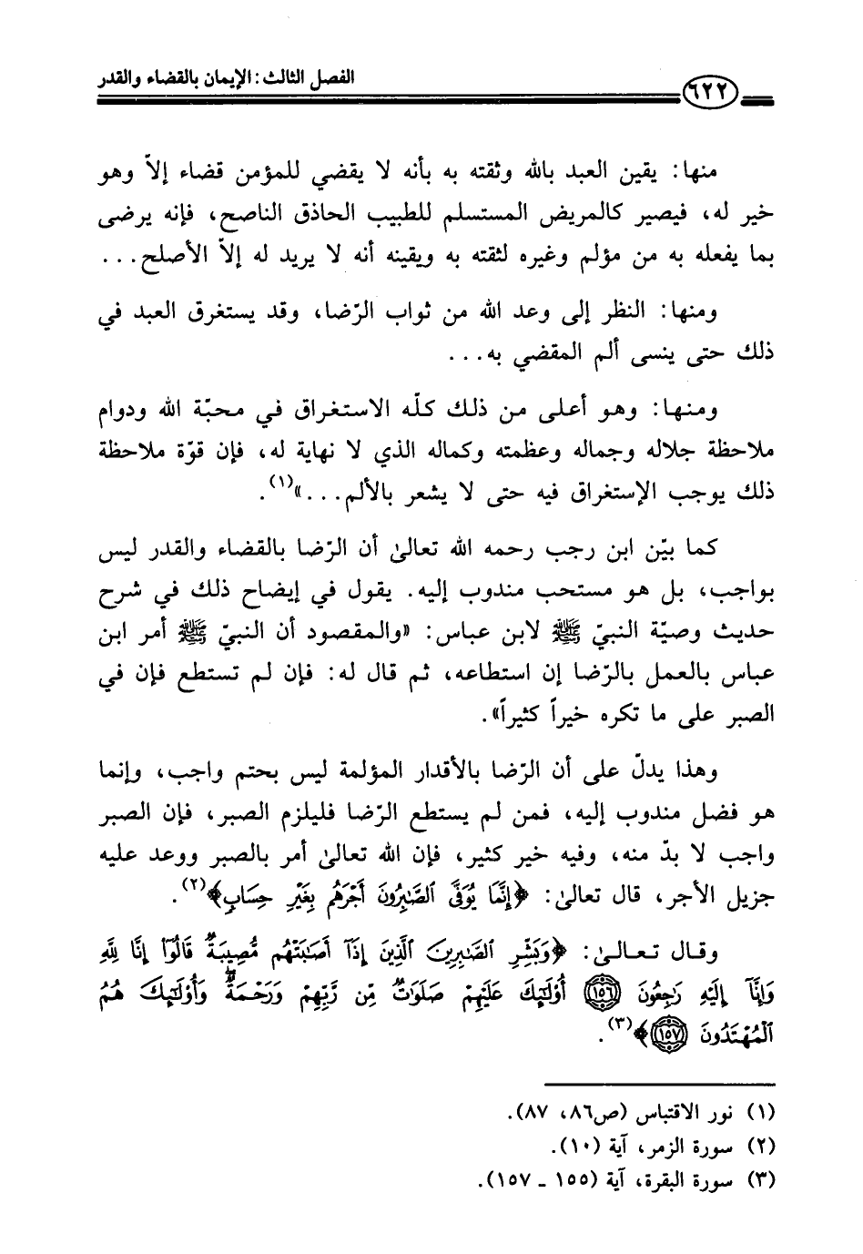 وهذا يدلّ على أن الرّضا بالأقدار المؤلمة ليس بحتم واجب، وإنما هو فضل مندوب إليه، فمن لم يستطع الرّضا فليلزم الصبر، فإن الصبر واجب لابدّ منه، وفيه خير كثير، فإن الله تعالى أمر بالصبر ووعد عليه جزيل الأجر، قال تعالى: {إِنَّمَا يُوَفَّى الصَّابِرُونَ أَجْرَهُمْ بِغَيْرِ حِسَابٍ} (¬٢).