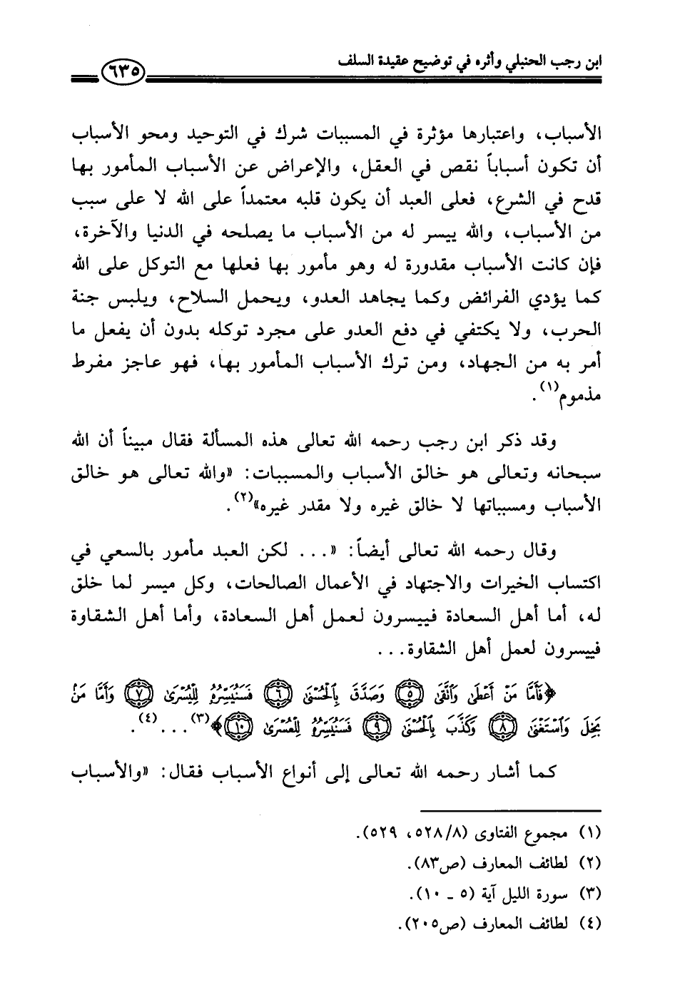 الأسباب، واعتبارها مؤثرة في المسببات شرك في التوحيد ومحو الأسباب أن تكون أسبابًا نقص في العقل، والإعراض عن الأسباب المأمور بها قدح في الشرع، فعلى العبد أن يكون قلبه معتمدًا على الله لا على سبب من الأسباب، والله ييسر له من الأسباب ما يصلحه في الدنيا والآخرة، فإن كانت الأسباب مقدورة له وهو مأمور بها فعلها مع التوكل على الله كما يؤدي الفرائض وكما يجاهد العدو، ويحمل السلاح، ويلبس جنة الحرب، ولا يكتفي في دفع العدو على مجرد توكله بدون أن يفعل ما أمر به من الجهاد، ومن ترك الأسباب المأمور بها، فهو عاجز مفرط مذموم (¬١).