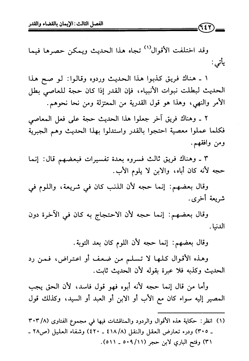 ١ - هناك فريق كذبوا هذا الحديث وردوه وقالوا: لو صح هذا الحديث لبطلت نبوات الأنبياء، فإن القدر إذا كان حجة للعاصي بطل الأمر والنهي، وهذا هو قول القدرية من المعتزلة ومن نحا نحوهم.