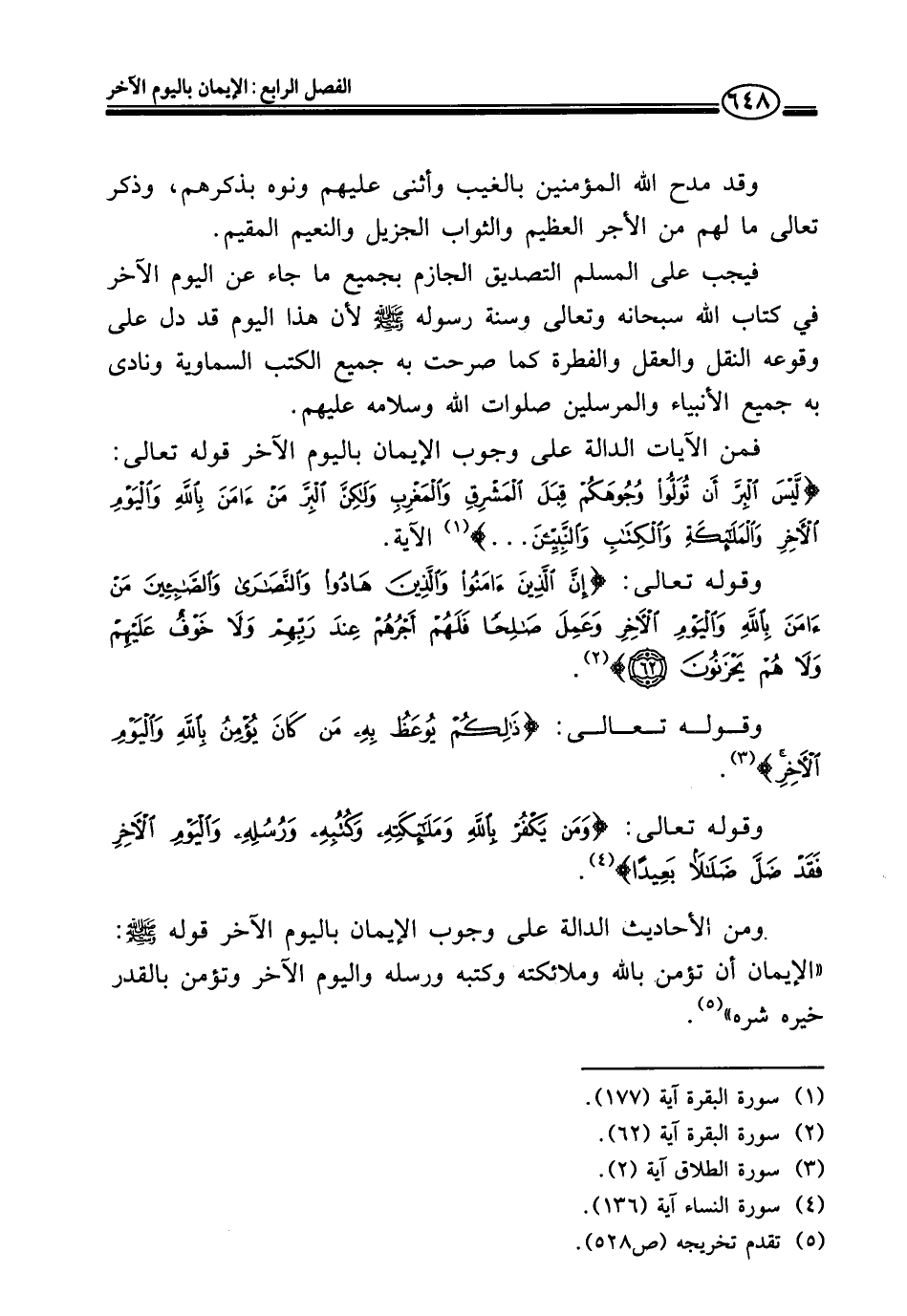 ومن الأحاديث الدالة على وجوب الإيمان باليوم الآخر قوله - صلى الله عليه وسلم -: "الإيمان أن تؤمن بالله وملائكته وكتبه ورسله واليوم الآخر وتؤمن بالقدر خيره شره" (¬٥).