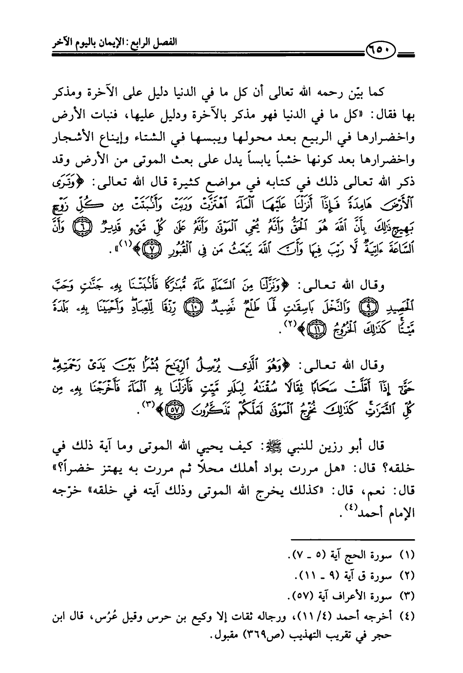وقال الله تعالى: {وَنَزَّلْنَا مِنَ السَّمَاءِ مَاءً مُبَارَكًا فَأَنْبَتْنَا بِهِ جَنَّاتٍ وَحَبَّ الْحَصِيدِ (٩) وَالنَّخْلَ بَاسِقَاتٍ لَهَا طَلْعٌ نَضِيدٌ (١٠) رِزْقًا لِلْعِبَادِ وَأَحْيَيْنَا بِهِ بَلْدَةً مَيْتًا كَذَلِكَ الْخُرُوجُ (١١)} (¬٢).
