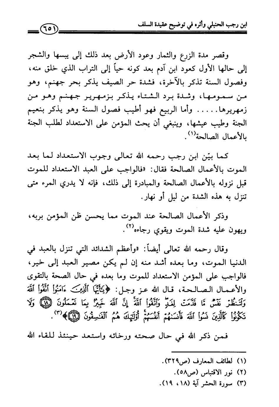 وقصر مدة الزرع والثمار وعود الأرض بعد ذلك إلى يبسها والشجر إلى حالها الأول كعود ابن آدم بعد كونه حيًا إلى التراب الذي خلق منه، وفصول السنة تذكر بالآخرة، فشدة حر الصيف يذكر بحر جهنم، وهو من سمومها، وشدة برد الشتاء يذكر بزمهرير جهنم وهو من زمهريرها ..... وأما الربيع فهو أطيب فصول السنة وهو يذكر بنعيم الجنة وطيب عيشها، وينبغي أن يحث المؤمن على الاستعداد لطلب الجنة بالأعمال الصالحة (¬١).