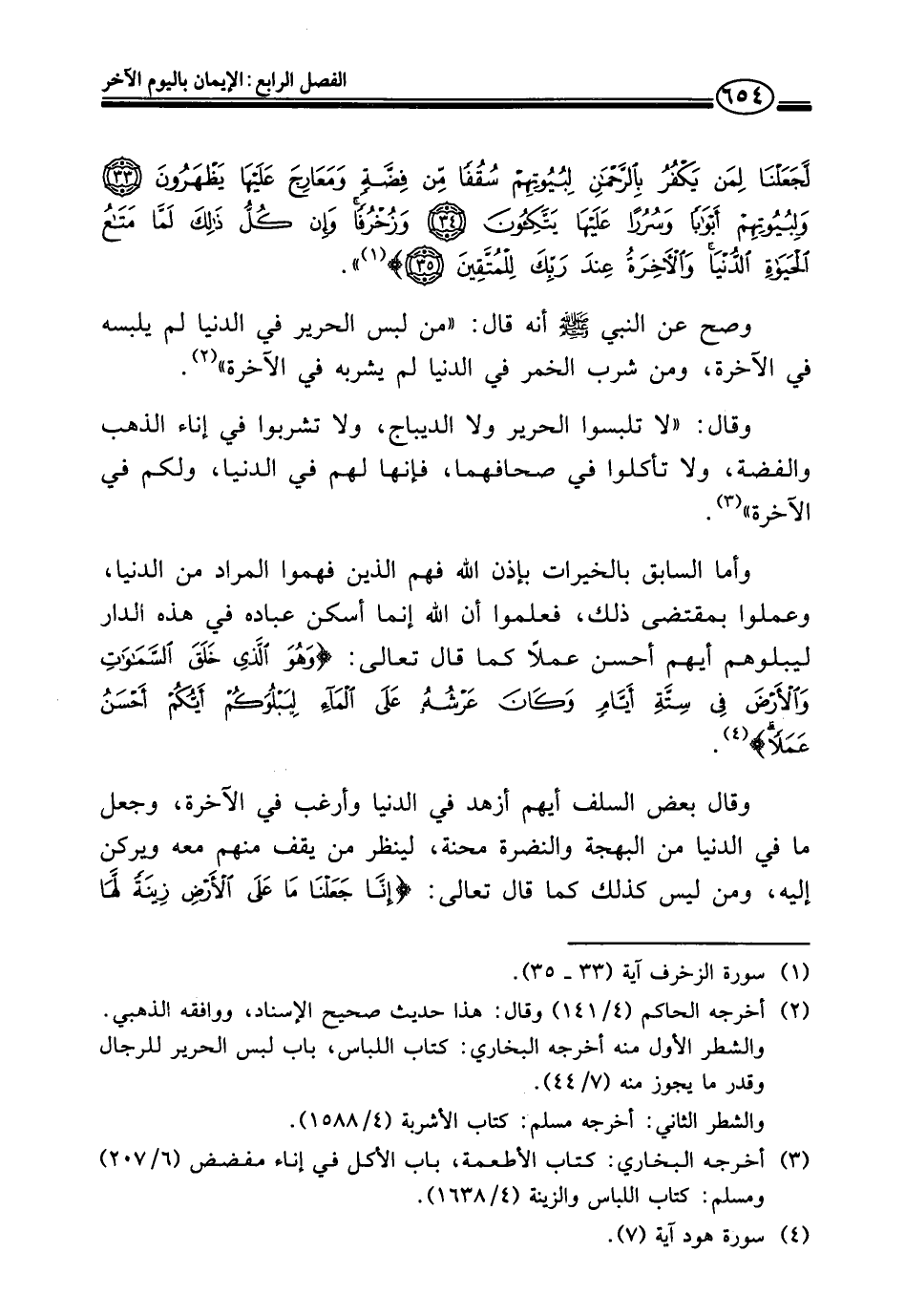 لَجَعَلْنَا لِمَنْ يَكْفُرُ بِالرَّحْمَنِ لِبُيُوتِهِمْ سُقُفًا مِنْ فِضَّةٍ وَمَعَارِجَ عَلَيْهَا يَظْهَرُونَ (٣٣) وَلِبُيُوتِهِمْ أَبْوَابًا وَسُرُرًا عَلَيْهَا يَتَّكِئُونَ (٣٤) وَزُخْرُفًا وَإِنْ كُلُّ ذَلِكَ لَمَّا مَتَاعُ الْحَيَاةِ الدُّنْيَا وَالْآخِرَةُ عِنْدَ رَبِّكَ لِلْمُتَّقِينَ (٣٥)} (¬١) ".