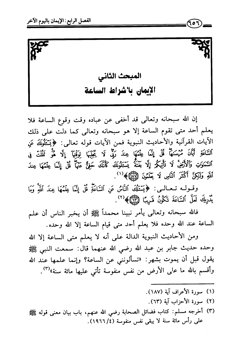 ومن الأحاديث النبوية الدالة على أنه لا يعلم متى الساعة إلا الله وحده حديث جابر بن عبد الله رضي الله عنهما قال: سمعت النبيّ - صلى الله عليه وسلم - يقول قبل أن يموت بشهر: "تسألونني عن الساعة؟ وإنما علمها عند الله وأقسم بالله ما على الأرض من نفس منفوسة تأتي عليها مائة سنة" (¬٣).