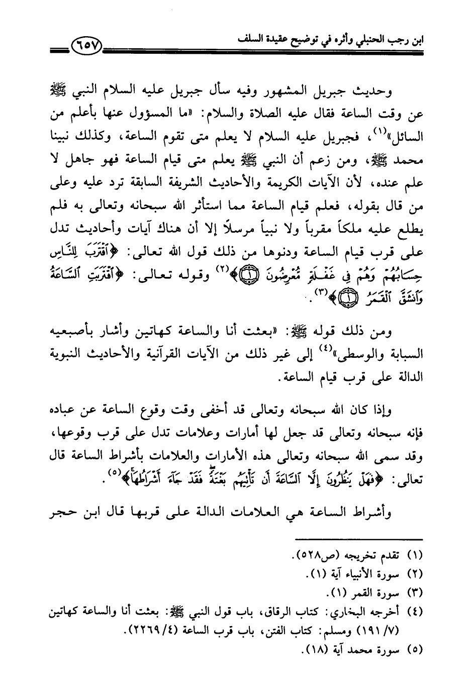 وحديث جبريل المشهور وفيه سأل جبريل عليه السلام النبيّ - صلى الله عليه وسلم - عن وقت الساعة فقال عليه الصلاة والسلام: "ما المسؤول عنها بأعلم من السائل" (¬١)، فجبريل عليه السلام لا يعلم متى تقوم الساعة، وكذلك نبينا محمد - صلى الله عليه وسلم -، ومن زعم أن النبيّ - صلى الله عليه وسلم - يعلم متى قيام الساعة فهو جاهل لا علم عنده، لأن الآيات الكريمة والأحاديث الشريفة السابقة ترد عليه وعلى من قال بقوله، فعلم قيام الساعة مما استأثر الله سبحانه وتعالى به فلم يطلع عليه ملكًا مقربًا ولا نبيًا مرسلًا إلا أن هناك آيات وأحاديث تدل على قرب قيام الساعة ودنوها من ذلك قول الله تعالى: {اقْتَرَبَ لِلنَّاسِ حِسَابُهُمْ وَهُمْ فِي غَفْلَةٍ مُعْرِضُونَ (١)} (¬٢) وقوله تعالى: {اقْتَرَبَتِ السَّاعَةُ وَانْشَقَّ الْقَمَرُ (١)} (¬٣).