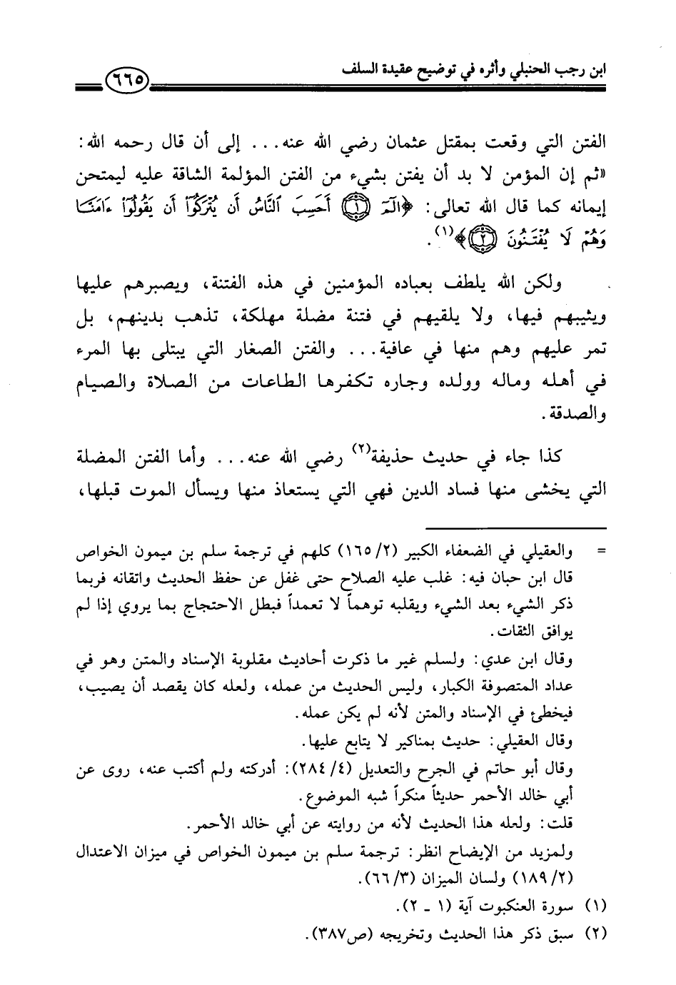 الفتن التي وقعت بمقتل عثمان رضي الله عنه. . . إلى أن قال رحمه الله: "ثم إن المؤمن لابد أن يفتن بشيء من الفتن المؤلمة الشاقة عليه ليمتحن إيمانه كما قال الله تعالى: {الم (١) أَحَسِبَ النَّاسُ أَنْ يُتْرَكُوا أَنْ يَقُولُوا آمَنَّا وَهُمْ لَا يُفْتَنُونَ (٢)} (¬١).