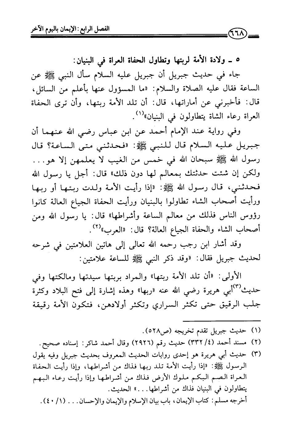 (¬٣) حديث أبي هريرة هو إحدى روايات الحديث المعروف بحديث جبريل وفيه يقول الرسول - صلى الله عليه وسلم -: "إذا رأيت الأمة تلد ربها فذاك من أشراطها، واذا رأيت الحفاة العراة الصم البكم ملوك الأرض فذاك من أشراطها واذا رأيت رعاء البهم يتطاولون في البنيان فذاك من أشراطها ... " الحديث.
