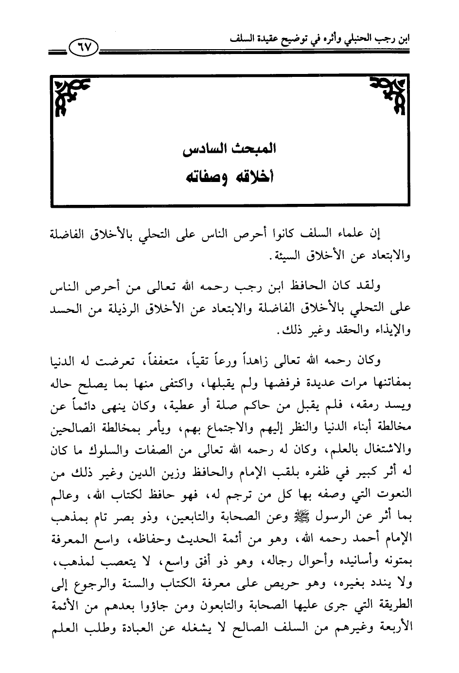 ولقد كان الحافظ ابن رجب رحمه الله تعالى من أحرص الناس على التحلي بالأخلاق الفاضلة والابتعاد عن الأخلاق الرذيلة من الحسد والإيذاء والحقد وغير ذلك.
