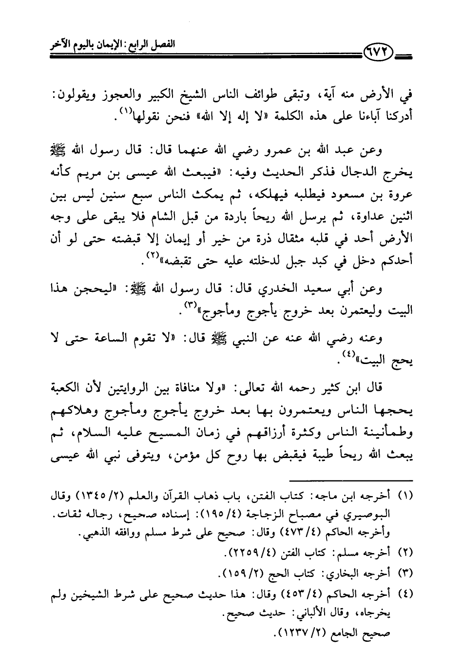 وعن عبد الله بن عمرو رضي الله عنهما قال: قال رسول الله - صلى الله عليه وسلم - يخرج الدجال فذكر الحديث وفيه: "فيبعث الله عيسى بن مريم كأنه عروة بن مسعود فيطلبه فيهلكه، ثم يمكث الناس سبع سنين ليس بين اثنين عداوة، ثم يرسل الله ريحًا باردة من قبل الشام فلا يبقى على وجه الأرض أحد في قلبه مثقال ذرة من خير أو إيمان إلَّا قبضته حتى لو أن أحدكم دخل في كبد جبل لدخلته عليه حتى تقبضه" (¬٢).