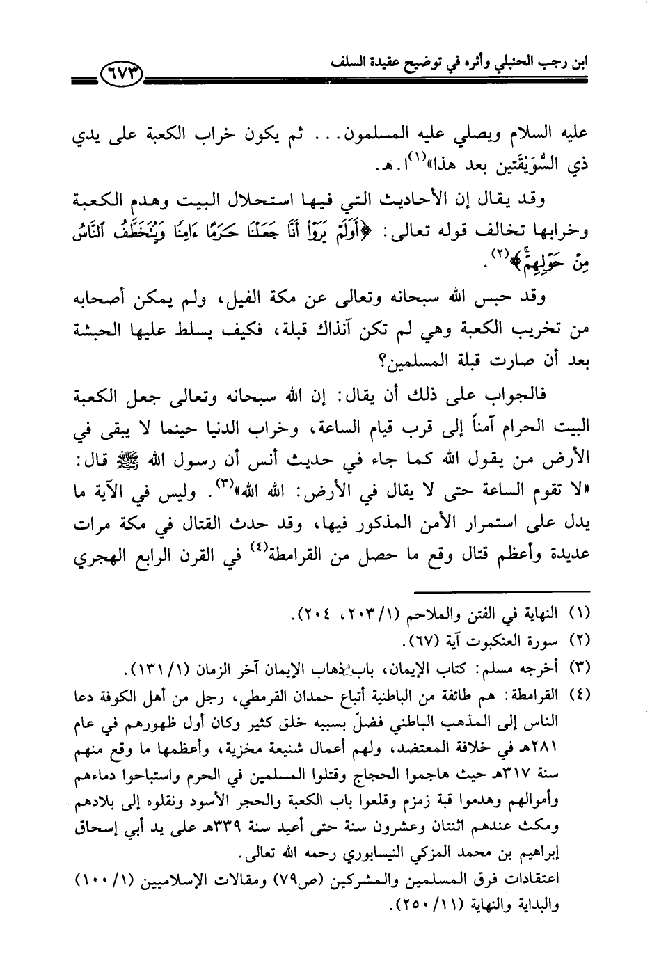 (¬٤) القرامطة: هم طائفة من الباطنية أتباع حمدان القرمطي، رجل من أهل الكوفة دعا الناس إلى المذهب الباطني فضلّ بسببه خلق كثير وكان أول ظهورهم في عام ٢٨١ هـ في خلافة المعتضد، ولهم أعمال شنيعة مخزية، وأعظمها ما وقع منهم سنة ٣١٧ هـ حيث هاجموا الحجاج وقتلوا المسلمين في الحرم واستباحوا دماءهم وأموالهم وهدموا قبة زمزم وقلعوا باب الكعبة والحجر الأسود ونقلوه إلى بلادهم ومكث عندهم اثنتان وعشرون سنة حتى أعيد سنة ٣٣٩ هـ على يد أبي إسحاق إبراهيم بن محمد المزكي النيسابوري رحمه الله تعالى.