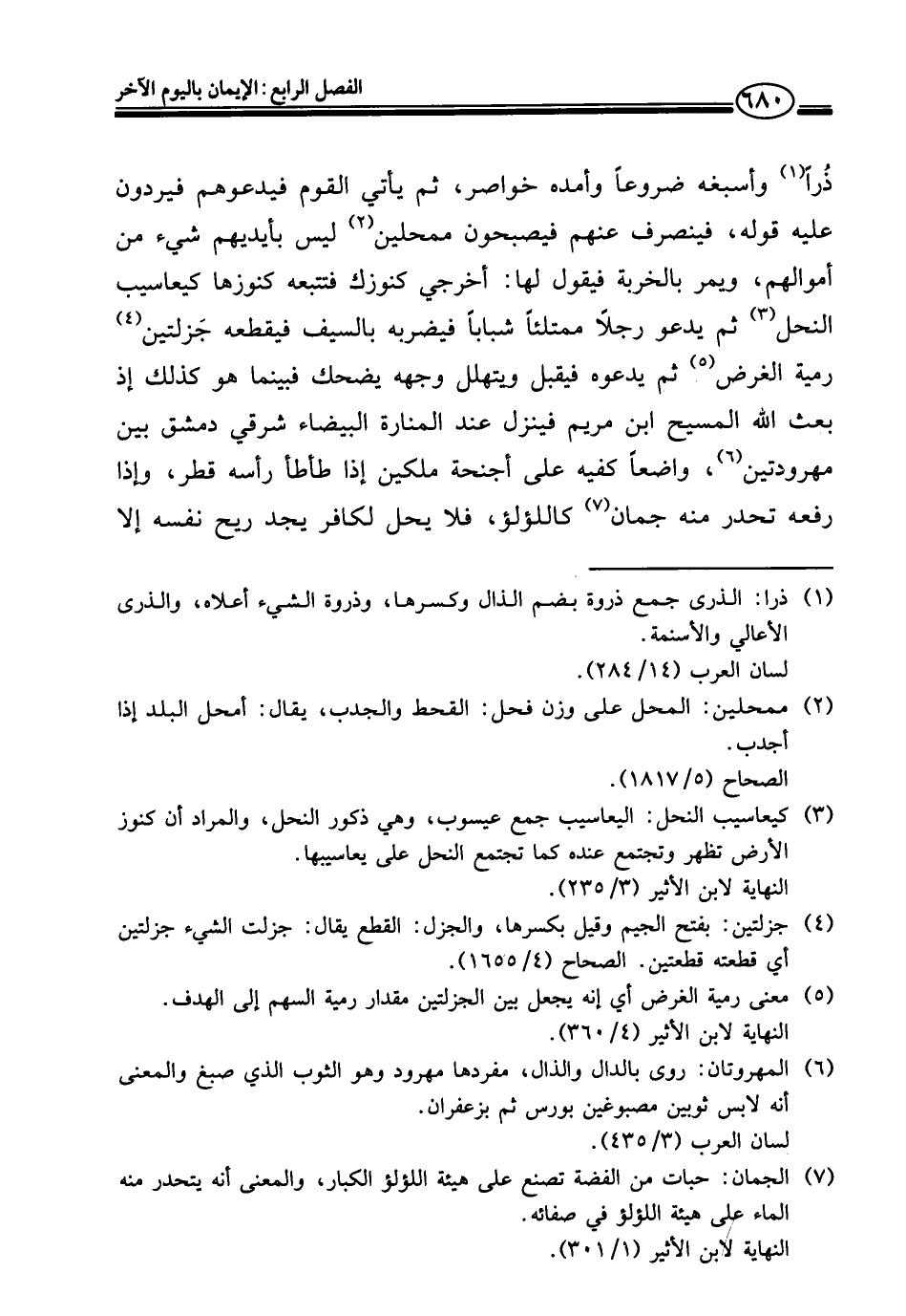 ذُرًا (¬١) وأسبغه ضروعًا وأمده خواصر، ثم يأتي القوم فيدعوهم فيردون عليه قوله، فينصرف عنهم فيصبحون ممحلين (¬٢) ليس بأيديهم شيء من أموالهم، ويمر بالخربة فيقول لها: أخرجي كنوزك فتتبعه كنوزها كيعاسيب النحل (¬٣) ثم يدعو رجلًا ممتلئًا شبابا فيضربه بالسيف فيقطعه جَزلتين (¬٤) رمية الغرض (¬٥) ثم يدعوه فيقبل ويتهلل وجهه يضحك فبينما هو كذلك إذ بعث الله المسيح ابن مريم فينزل عند المنارة البيضاء شرقي دمشق بين مهرودتين (¬٦)، واضعًا كفيه على أجنحة ملكين إذا طاطأ رأسه قطر، وإذا رفعه تحدر منه جمان (¬٧) كاللؤلؤ، فلا يحل لكافر يجد ريح نفسه إلا