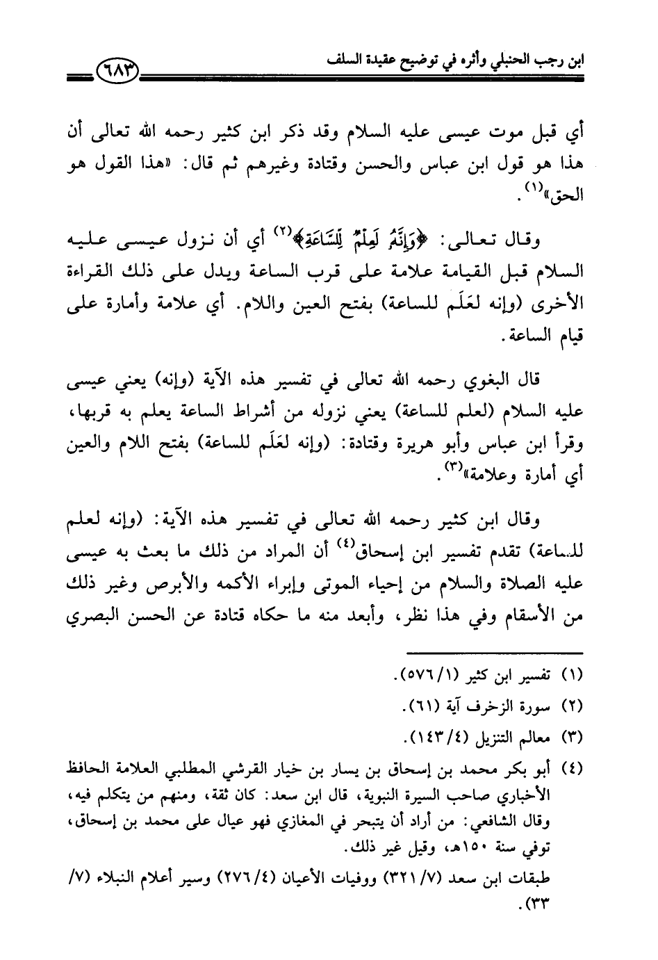وقال ابن كثير رحمه الله تعالى في تفسير هذه الآية: (وإنه لعلم للساعة) تقدم تفسير ابن إسحاق (¬٤) أن المراد من ذلك ما بعث به عيسى عليه الصلاة والسلام من إحياء الموتى وإبراء الأكمه والأبرص وغير ذلك من الأسقام وفي هذا نظر، وأبعد منه ما حكاه قتادة عن الحسن البصري