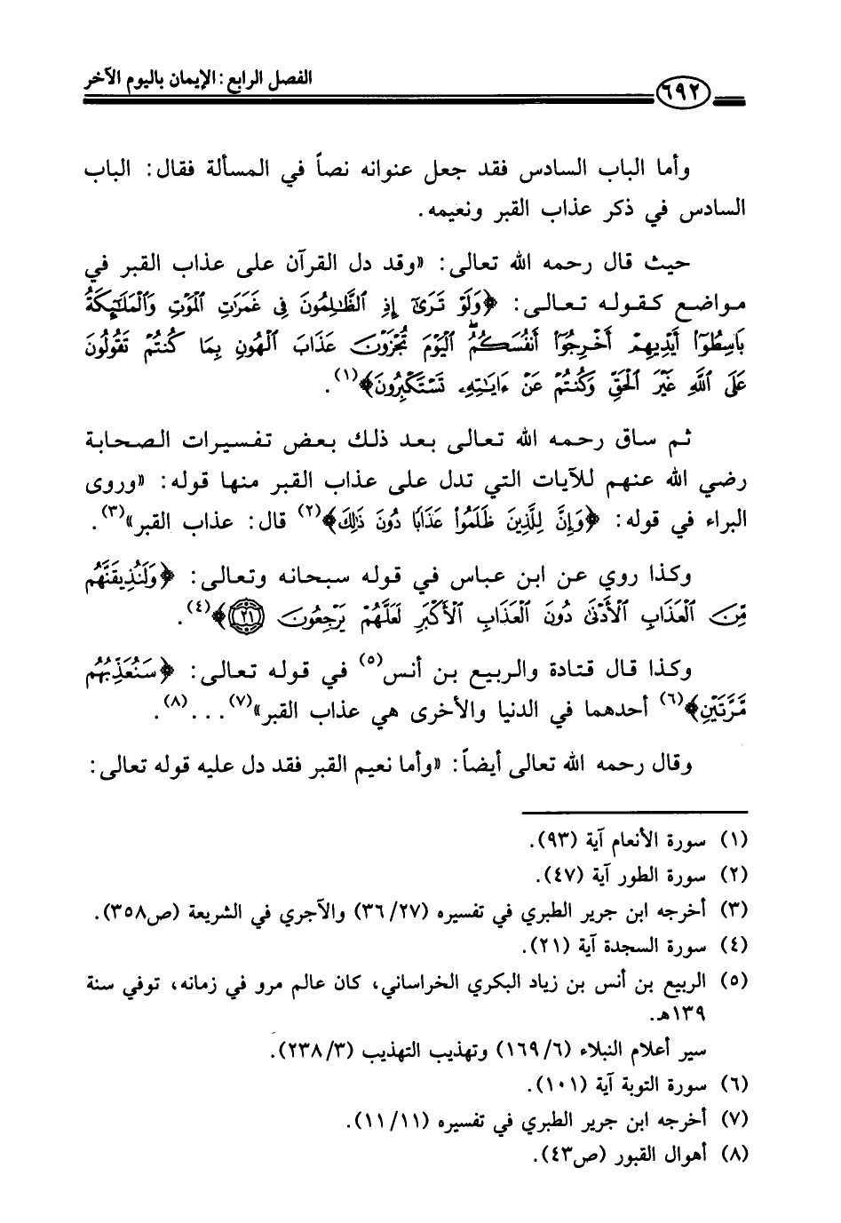 وقال رحمه الله تعالى أيضًا: "وأما نعيم القبر فقد دلّ عليه قوله تعالى: