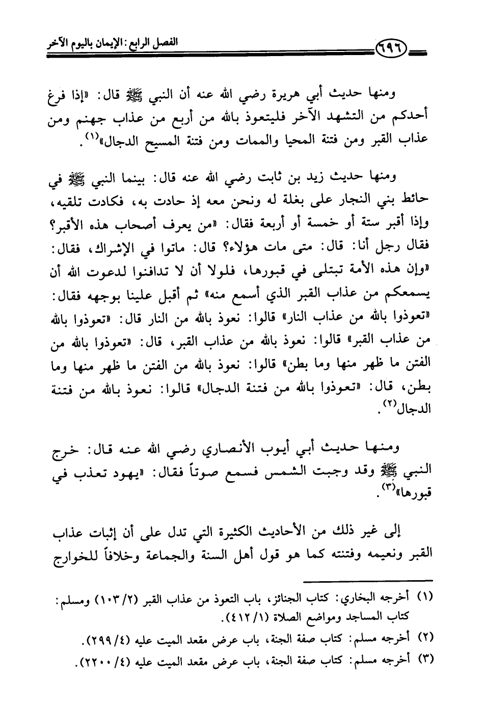 إلى غير ذلك من الأحاديث الكثيرة التي تدل على أن إثبات عذاب القبر ونعيمه وفتنته كما هو قول أهل السنة والجماعة وخلافًا للخوارج