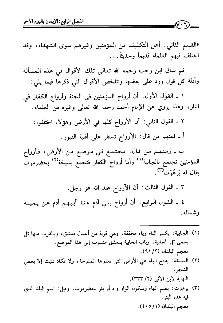 ب - ومنهم من قال: تجتمع في موضع من الأرض، فأرواح المؤمنين تجتمع بالجابية (¬١) وأما أرواح الكفار فتجمع بسبخة (¬٢) بحضرموت يقال له بَرهُوْت (¬٣).