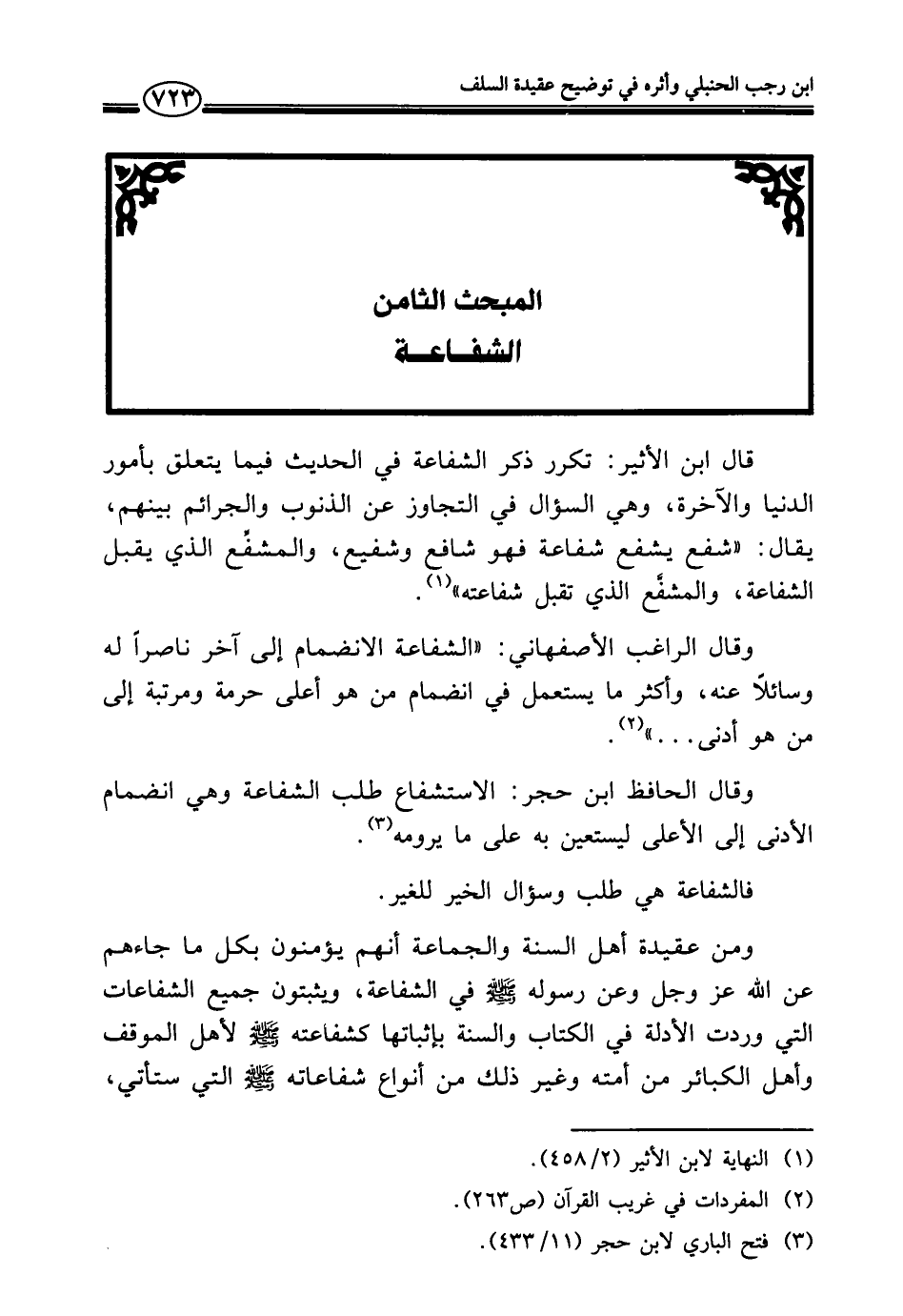 وقال الراغب الأصفهاني: "الشفاعة الانضمام إلى آخر ناصرًا له وسائلًا عنه، وأكثر ما يستعمل في انضمام من هو أعلى حرمة ومرتبة إلى من هو أدنى ... " (¬٢).
