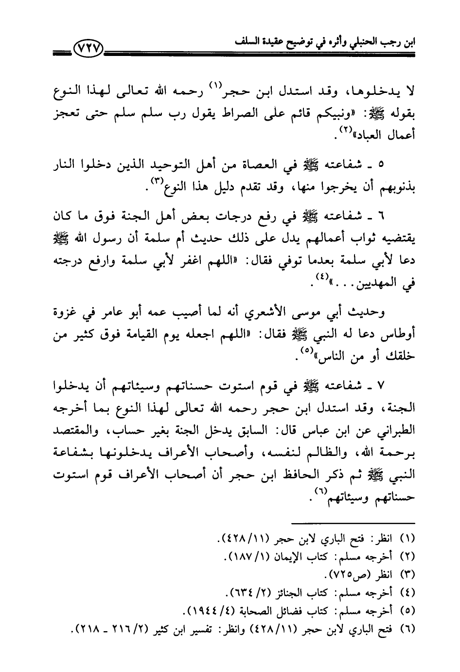 لا يدخلوها، وقد استدل ابن حجر (¬١) رحمه الله تعالى لهذا النوع بقوله - صلى الله عليه وسلم -: "ونبيكم قائم على الصراط يقول رب سلم سلم حتى تعجز أعمال العباد" (¬٢).