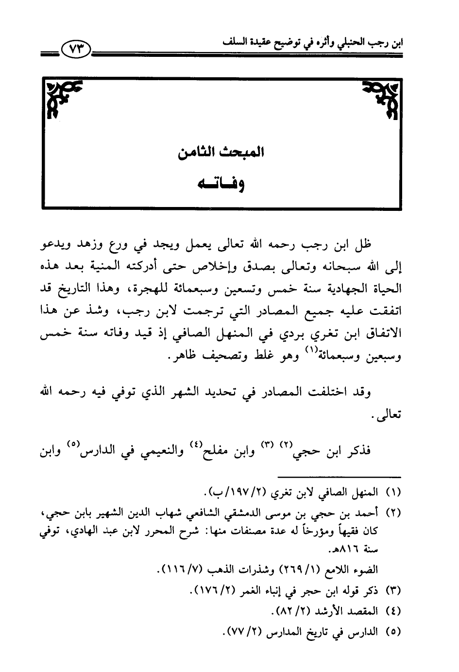 ظل ابن رجب رحمه الله تعالى يعمل ويجد في ورع وزهد ويدعو إلى الله سبحانه وتعالى بصدق وإخلاص حتى أدركته المنية بعد هذه الحياة الجهادية سنة خمس وتسعين وسبعمائة للهجرة، وهذا التاريخ قد اتفقت عليه جميع المصادر التي ترجمت لابن رجب، وشذ عن هذا الاتفاق ابن تغري بردي في المنهل الصافي إذ قيد وفاته سنة خمس وسبعين وسبعمائة (¬١) وهو غلط وتصحيف ظاهر.