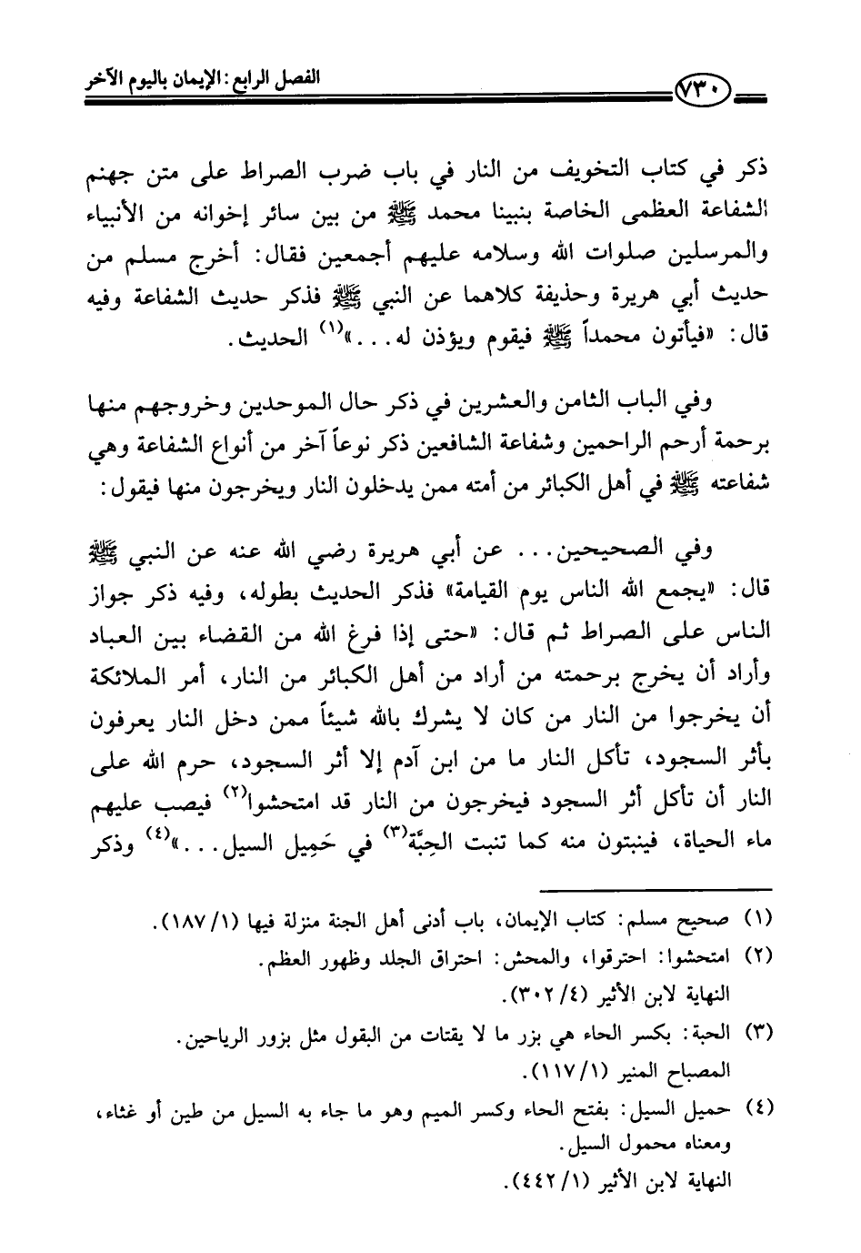 وفي الصحيحين ... عن أبي هريرة رضي الله عنه عن النبي - صلى الله عليه وسلم - قال: "يجمع الله الناس يوم القيامة" فذكر الحديث بطوله، وفيه ذكر جواز الناس على الصراط ثم قال: "حتى إذا فرغ الله من القضاء بين العباد وأراد أن يخرج برحمته من أراد من أهل الكبائر من النار، أمر الملائكة أن يخرجوا من النار من كان لا يشرك بالله شيئا ممن دخل النار يعرفون بأثر السجود، تأكل النار ما من ابن آدم إلا أثر السجود، حرم الله على النار أن تأكل أثر السجود فيخرجون من النار قد امتحشوا (¬٢) فيصب عليهم ماء الحياة، فينبتون منه كما تنبت الحِبَّة (¬٣) في حَمِيل السيل ... " (¬٤) وذكر