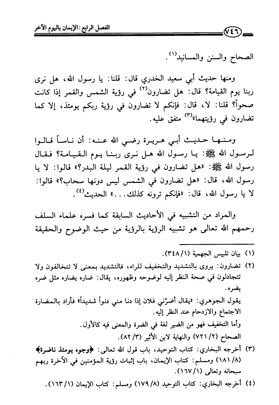 (¬٣) أخرجه البخاري: كتاب التوحيد، باب قول الله تعالى: {وُجُوهٌ يَوْمَئِذٍ نَاضِرَةٌ} (٨/ ١٨١) ومسلم: كتاب الإيمان، باب إثبات رؤية المؤمنين في الآخرة ربهم سبحانه وتعالى (١/ ١٦٧).