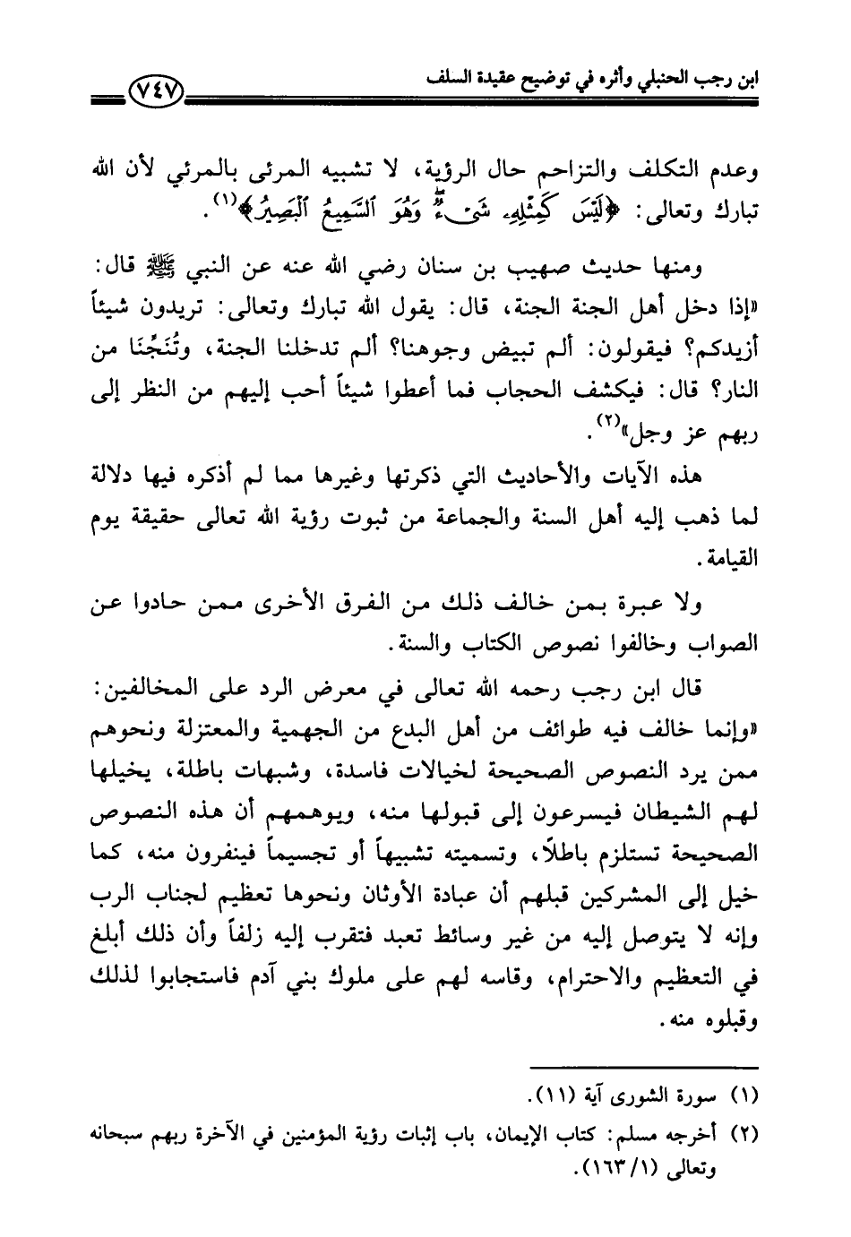 وعدم التكلف والتزاحم حال الرؤية، لا تشبيه المرئى بالمرئي لأن الله تبارك وتعالى: {لَيْسَ كَمِثْلِهِ شَيْءٌ وَهُوَ السَّمِيعُ الْبَصِيرُ} (¬١).