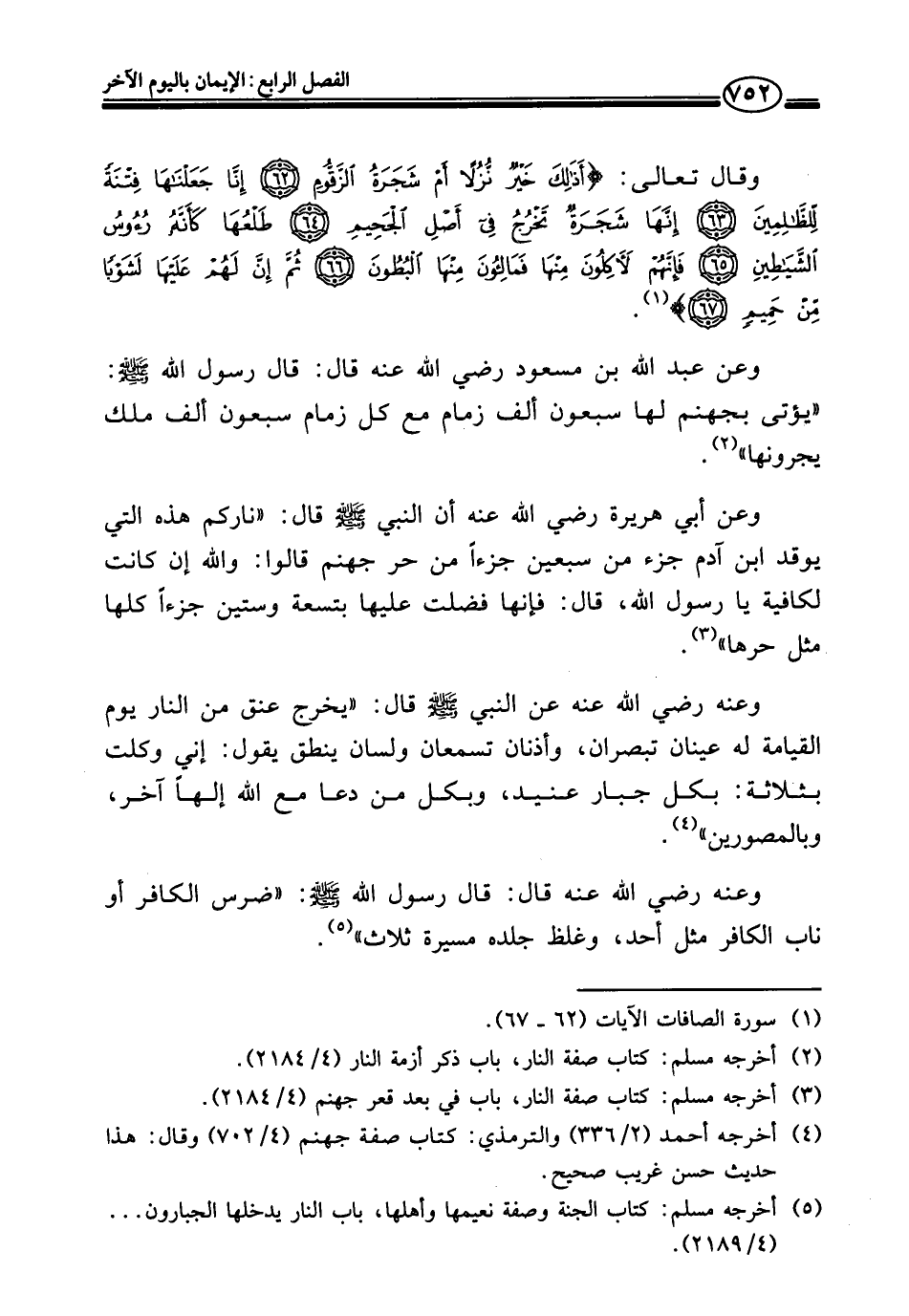 وعن عبد الله بن مسعود رضي الله عنه قال: قال رسول الله - صلى الله عليه وسلم -: "يؤتى بجهنم لها سبعون ألف زمام مع كل زمام سبعون ألف ملك يجرونها" (¬٢).